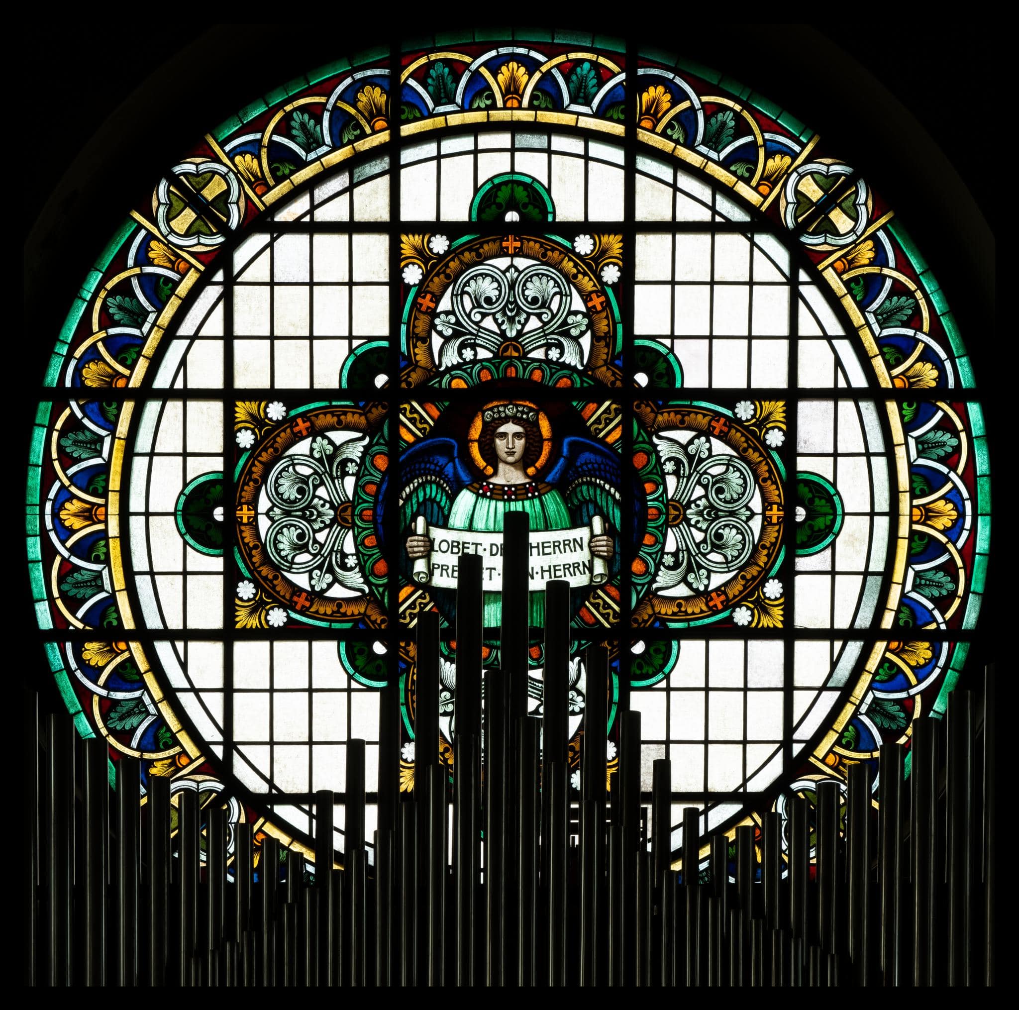 Mit opaken Rechtecken blank verglastes Rundfenster mit Rahmenverzierung, dem ein ornamentierter Vierpass einbeschrieben ist. Im Zentrum erscheint die Halbfigur eines Engels, der ein Spruchband in den Händen hält. Das Netz aus Quereisen betont die Kreuzform.