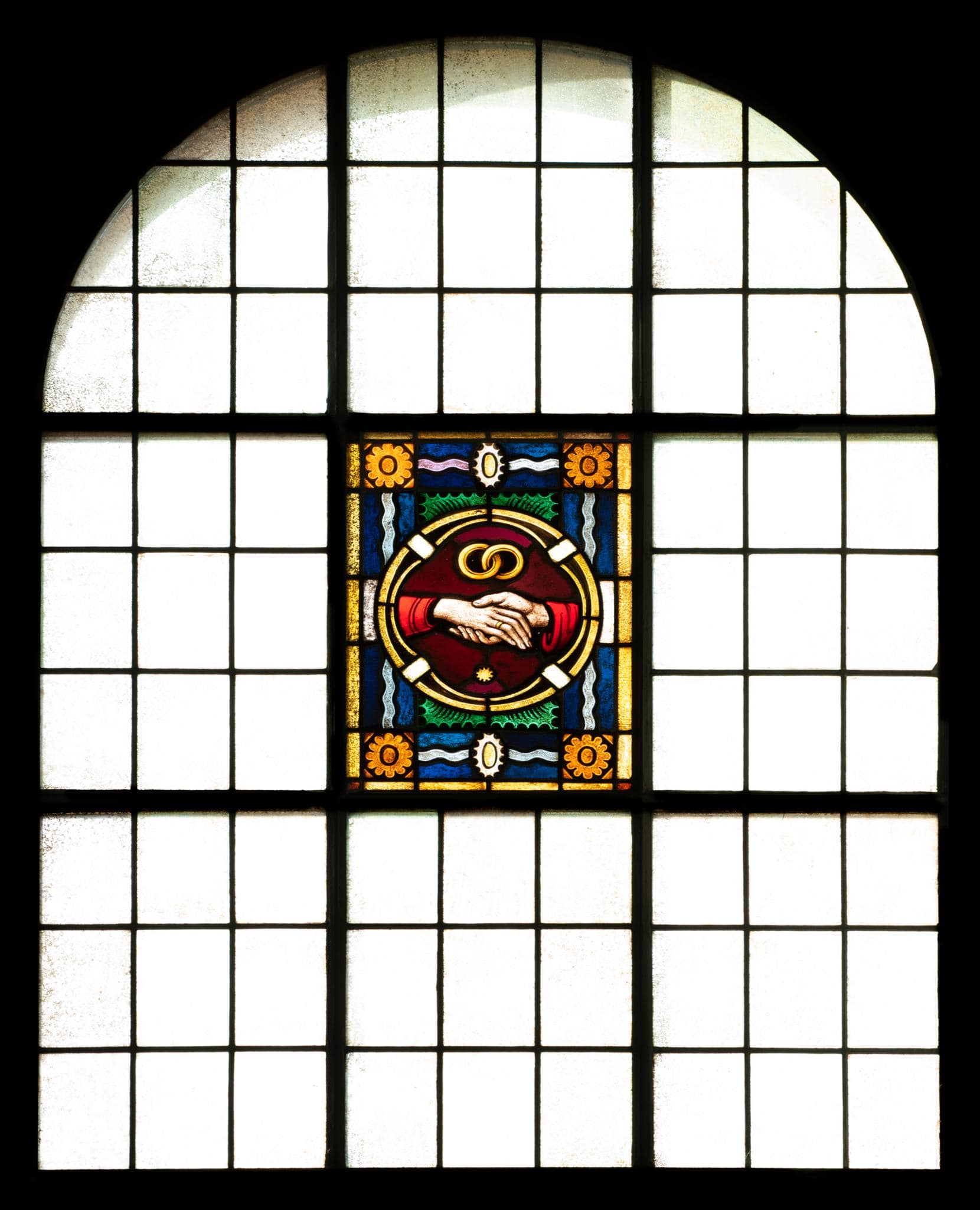 Mit opaken Rechtecken blank verglastes neunteiliges Rundbogenfenster. Im mittleren Feld eine Darstellung des Sakraments der Ehe in einem Medaillon vor ornamentiertem Hintergrund. Das Sakrament ist verbildlicht durch zwei ineinander verschlungene Ringe und zwei sich haltende Hände als Sinnbild der Treue und Liebe.