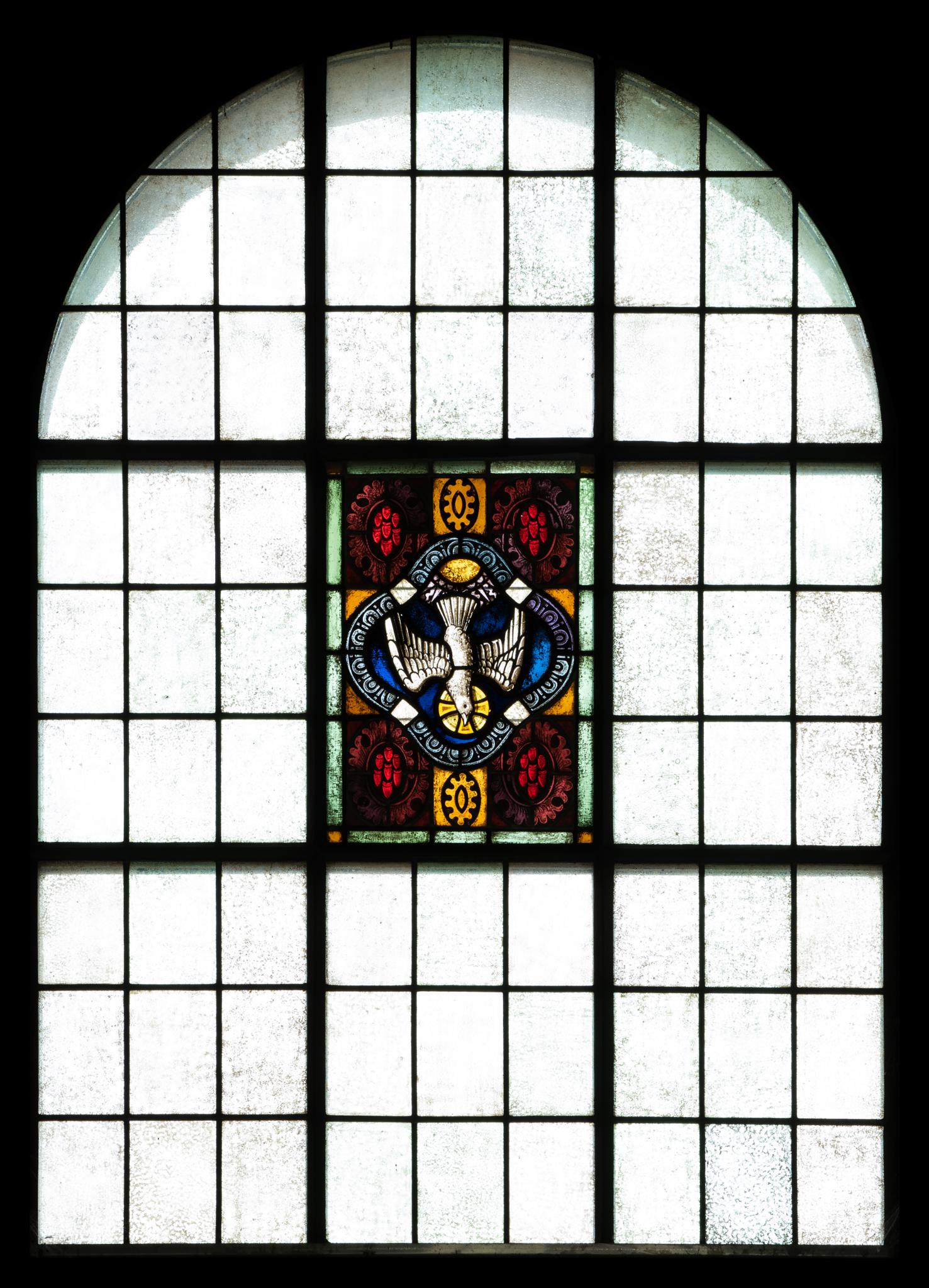 Mit opaken Rechtecken blank verglastes neunteiliges Rundbogenfenster. Im mittleren Feld eine Darstellung des Sakraments der Firmung in einem Medaillon vor ornamentiertem Hintergrund. Das Sakrament des Heilihen Geistes ist verbildlicht durch die nach unten fliegende Taube mit Nimbus.