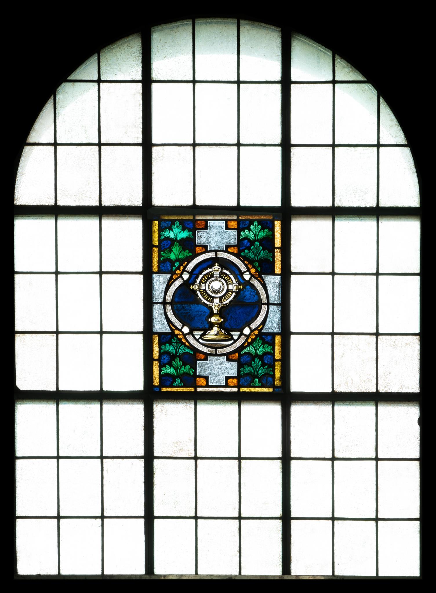 Mit opaken Rechtecken blank verglastes neunteiliges Rundbogenfenster. Im mittleren Feld eine Darstellung des Sakraments der Eucharistie in einem Medaillon vor ornamentiertem Hintergrund. Das Sakrament ist verbildlicht durch eine Monstranz mit Hostie.