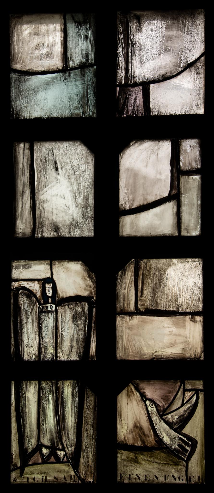 Rechteckiges, hauptsächlich in Grautönen gehaltenes Fenster, das durch breite Metallsprossen unterteilt ist. Im unteren linken Viertel ist ein Engel dargestellt, daneben rechts eine am Boden sitzende Taube.