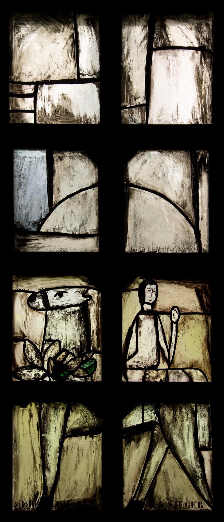 Rechteckiges, hauptsächlich in Grautönen gehaltenes Fenster, das durch breite Metallsprossen unterteilt ist. In der unteren Hälfte ist ein Pferd mit Reiter dargestellt. Das weisse Pferd trägt einen Blätterkranz um den Hals, der Reiter hat die linke Hand erhoben.