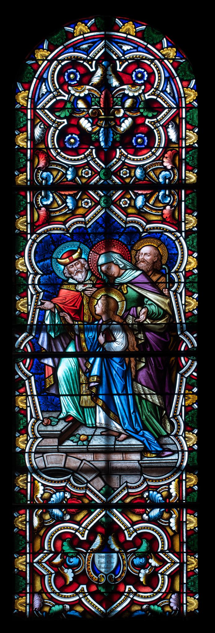 Vierteiliges Rundbogenfenster mit der Darstellung von Mariae Tempelgang in den beiden mittleren Feldern. Maria steigt mit ihrer Mutter Anna, dem Vater Joachim und dem Hohepriester die Stufen zum Tempel hoch. Die Szene ist in Anlehnung an mittelalterliche Kirchenfenster in einem Medaillon dargestellt, umgeben von reichen farbigen Blatt- und Blütenornamenten. Am Scheibenfuss Schild mit Stifterinschrift.