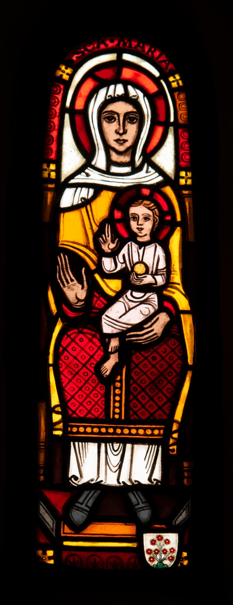 Die thronende Maria mit dem Christuskind auf ihrem Schoss. Rechts unten ein kleines Wappen.