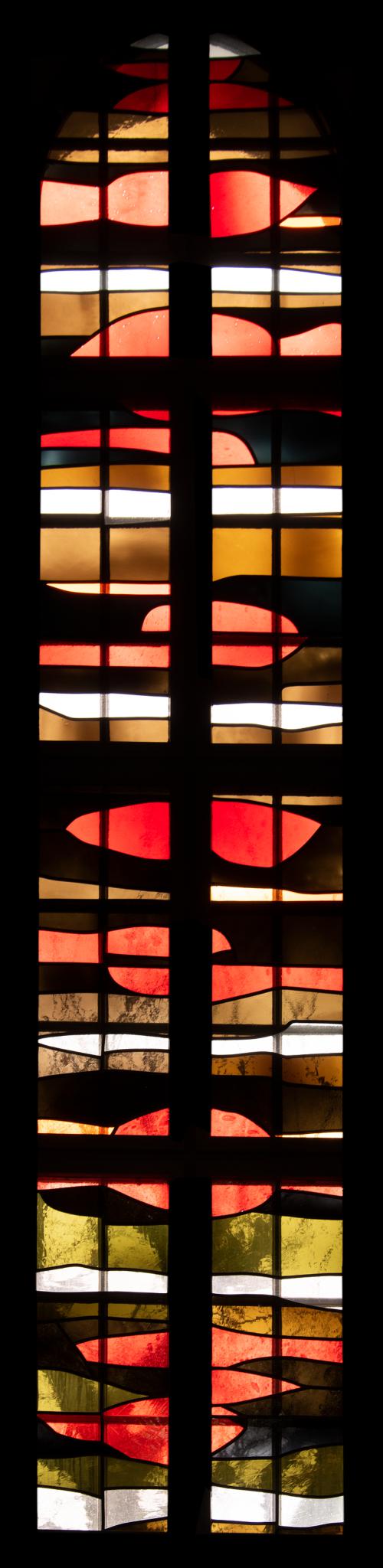 Hohes Spitzbogenfenster mit horizontalen Formen in Rottönen.