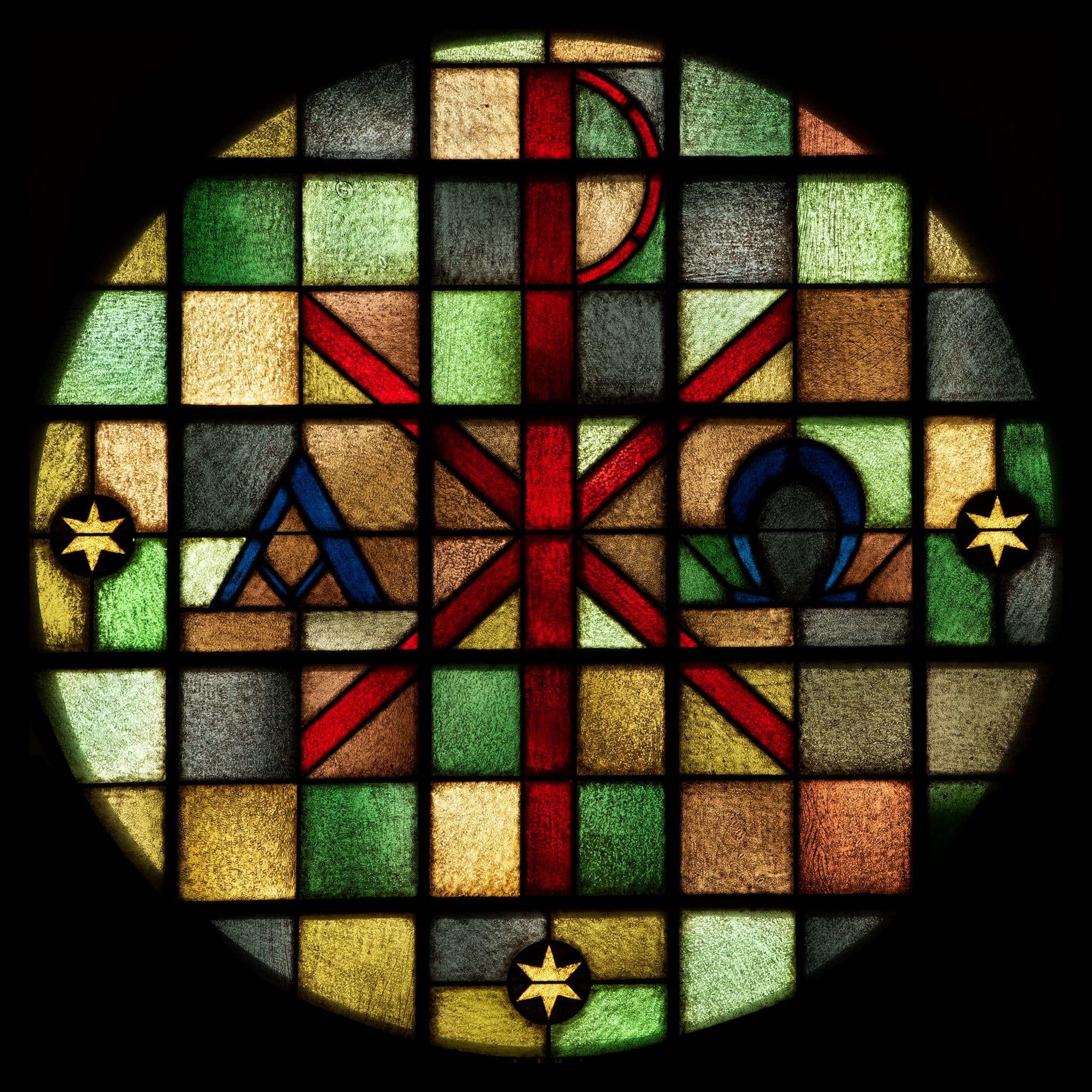 Rundes Fenster mit Christusmonogramm, Alpha und Omega.