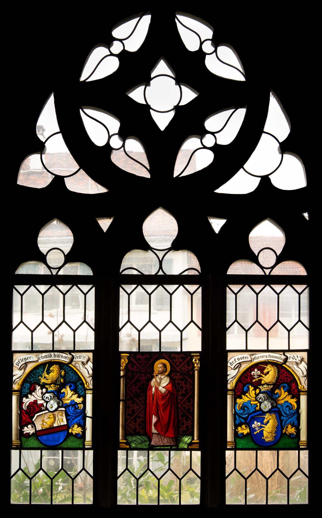 Das mit Schweizerrauten blank verglaste Masswerkfenster enthält drei Einzelscheiben: links eine Wappenscheibe Schmid, in der Mitte einen Heiligen, rechts eine Wappenscheibe des Fridolin Suter. Die beiden Wappenscheiben zeigen das Vollwappen vor Damastgrund, umfangen von einem Astwerkbogen. Am Scheibenfuss Rasengrund, über dem Bogen ein Inschriftband. Der Heilige, vermutlich der jesuitische Missionar Franz Xaver, trägt ein liturgisches Gewand und hält ein Kruzifix, welches er an einer Kordel um den Hals trägt, in den Händen. Er steht vor violettem Damastgrund auf einem grünen Rasenboden. Zu beiden Seiten stehen Säulen.