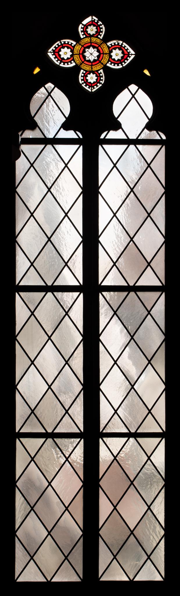 Zweilanzettiges Masswerkfenster mit blanker Rautenverglasung, im farbig gestalteten Couronnement (Vierpass) stilisierte Blüten und Ornamente. Identisch mit gegenüberliegendem Fenster s VI.