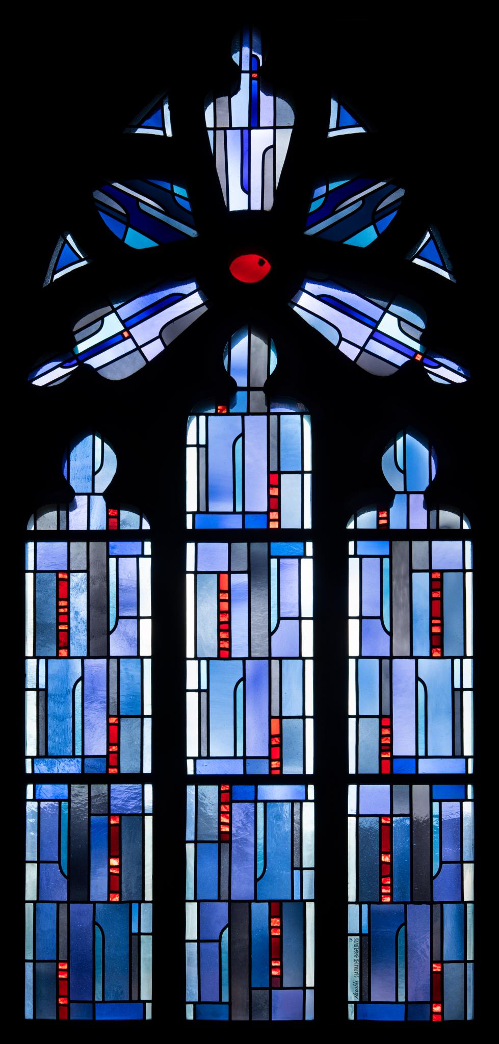 Dreilanzettiges Masswerkfenster mit schmalen, rechteckigen, blauen und roten Glasstücken abstrakt-geometrisch gestaltet. Identisch mit gegenüberliegendem Fenster n VII (TG_762).