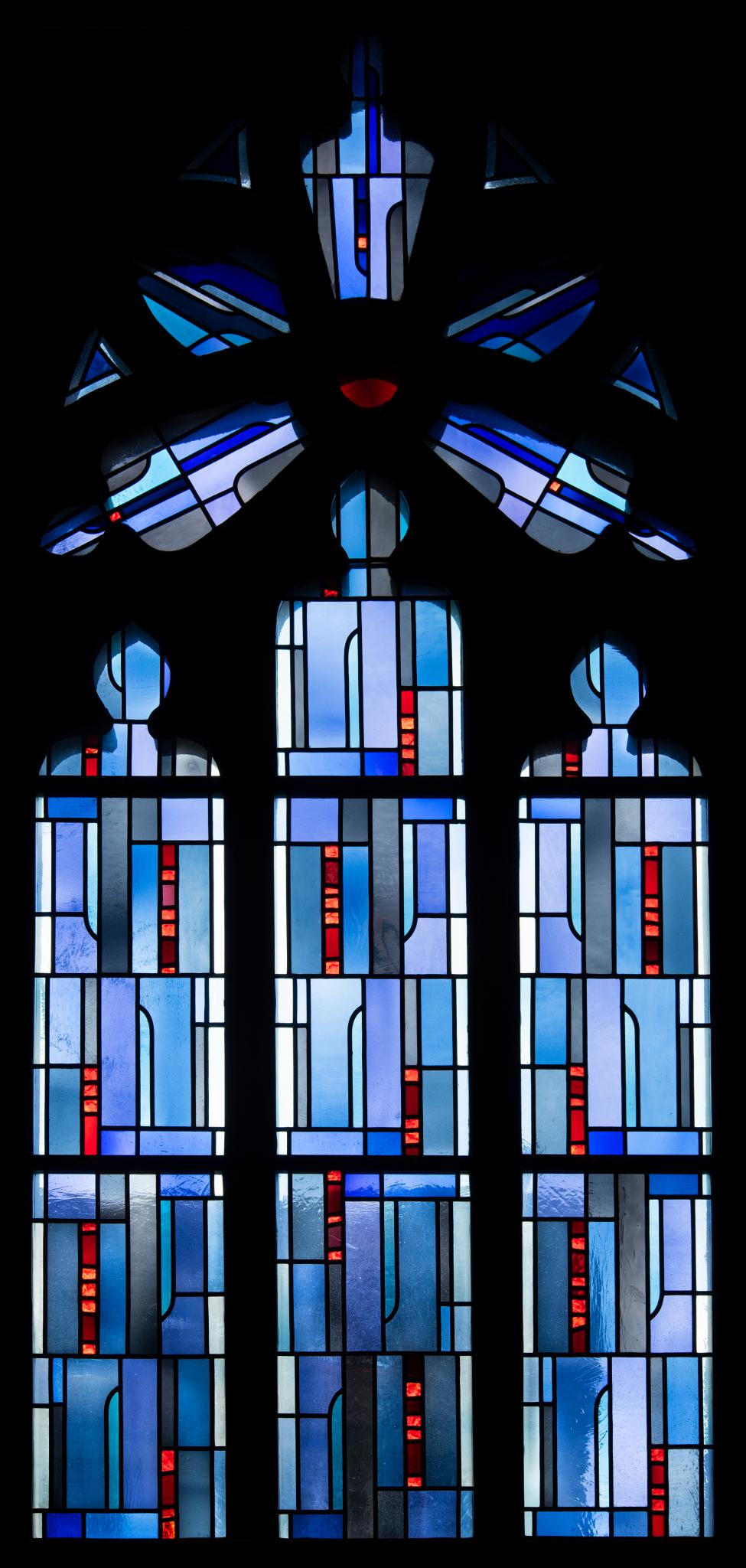 Dreilanzettiges Masswerkfenster mit schmalen, rechteckigen, blauen und roten Glasstücken abstrakt-geometrisch gestaltet. Identisch mit gegenüberliegendem Fenster s VII (TG_761).