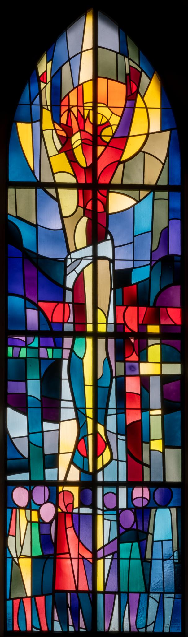 Spitzbogenfenster. Vor dem gekreuzigten Christus mit Dornenkrone und Wundmalen steht eine Gruppe von Menschen. Die Arme Christi sind nicht mehr an das Kreuz gebunden, sondern gen Himmel gestreckt. Im Hintergrund sind weitere, leere Kreuze zu sehen.