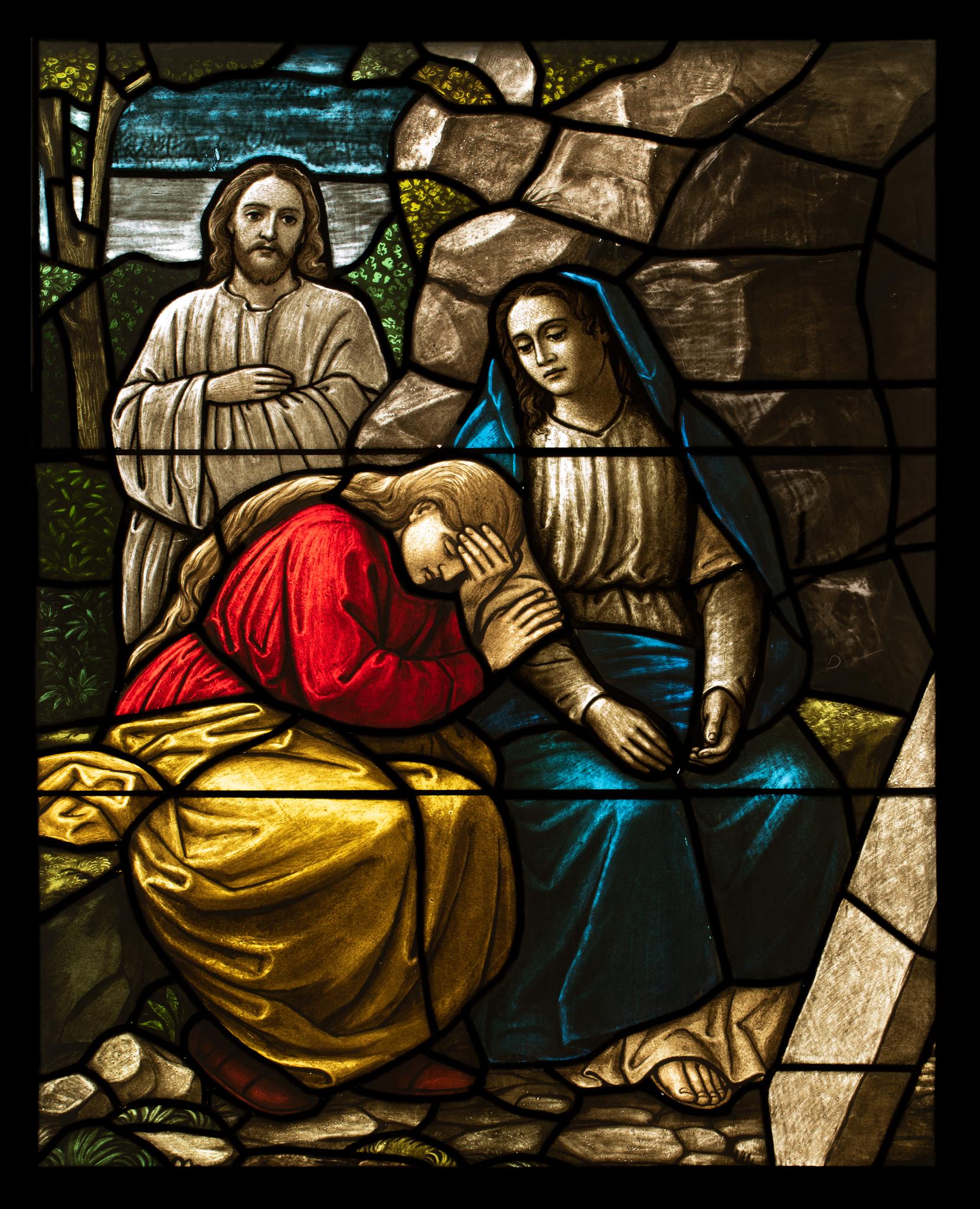 Blankverglastes zehnteiliges Segmentbogenfenster mit Glasmalerei im zweiten Register. Die Glasmalerei zeigt zwei trauernde Frauen am leeren Grab Christi, links wohl Maria Magdalena. Hinter den sitzenden Frauen steht, von den beiden unbemerkt, der auferstandene Christus in weissem Gewand.
