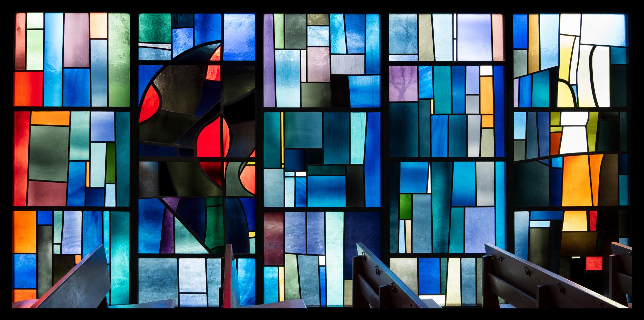 Glasmalereiwand in Blau- und Grüntönen. Links rote Flammen des Heiligen Geistes, rechts helle, in die Höhe strebende Formen als Zeichen der Auferstehung.