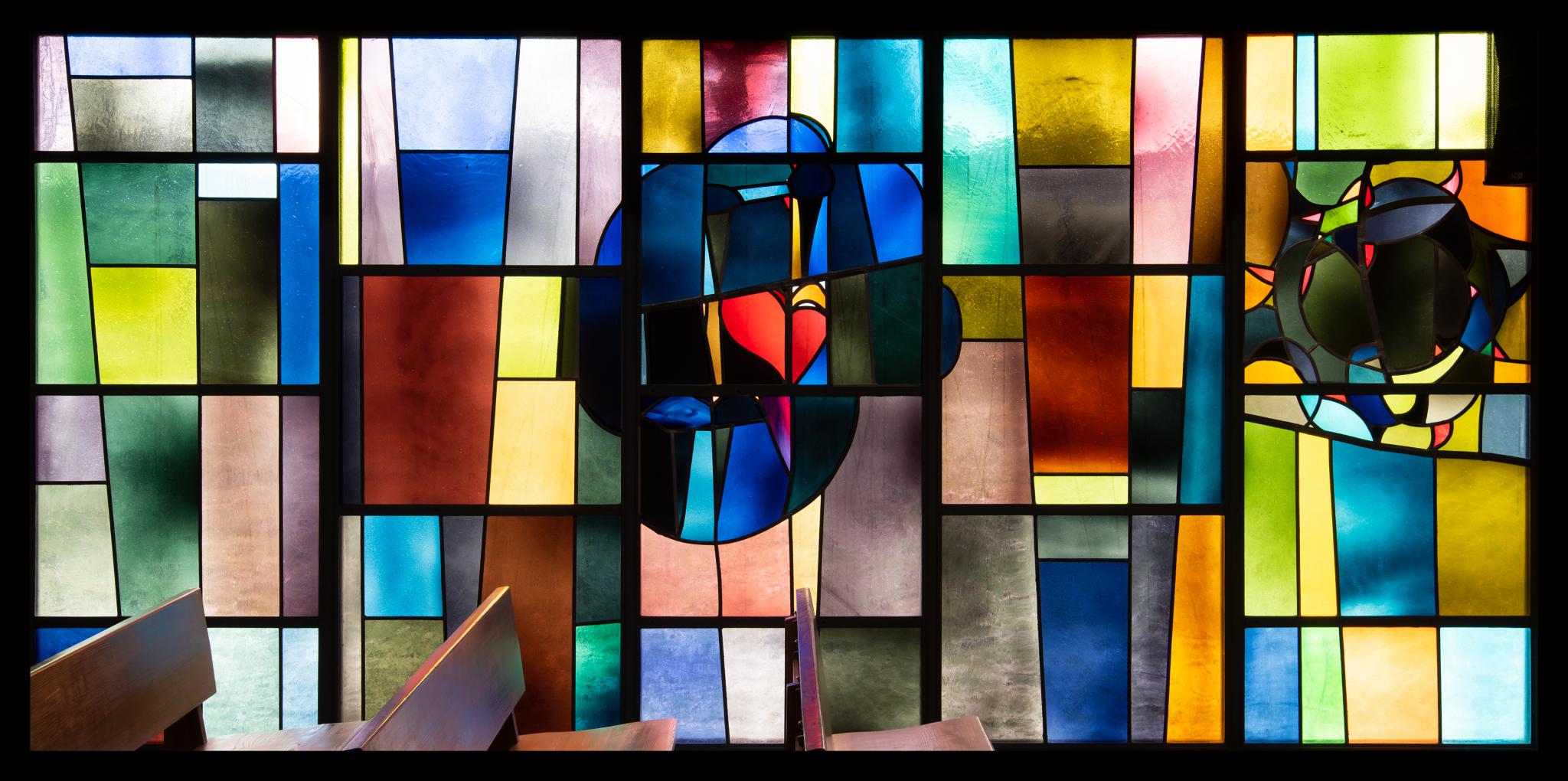Glasmalereiwand aus verschiedenfarbigen Rechtecken. Links Darstellung des Herz Jesu, rechts die Dornenkrone.
