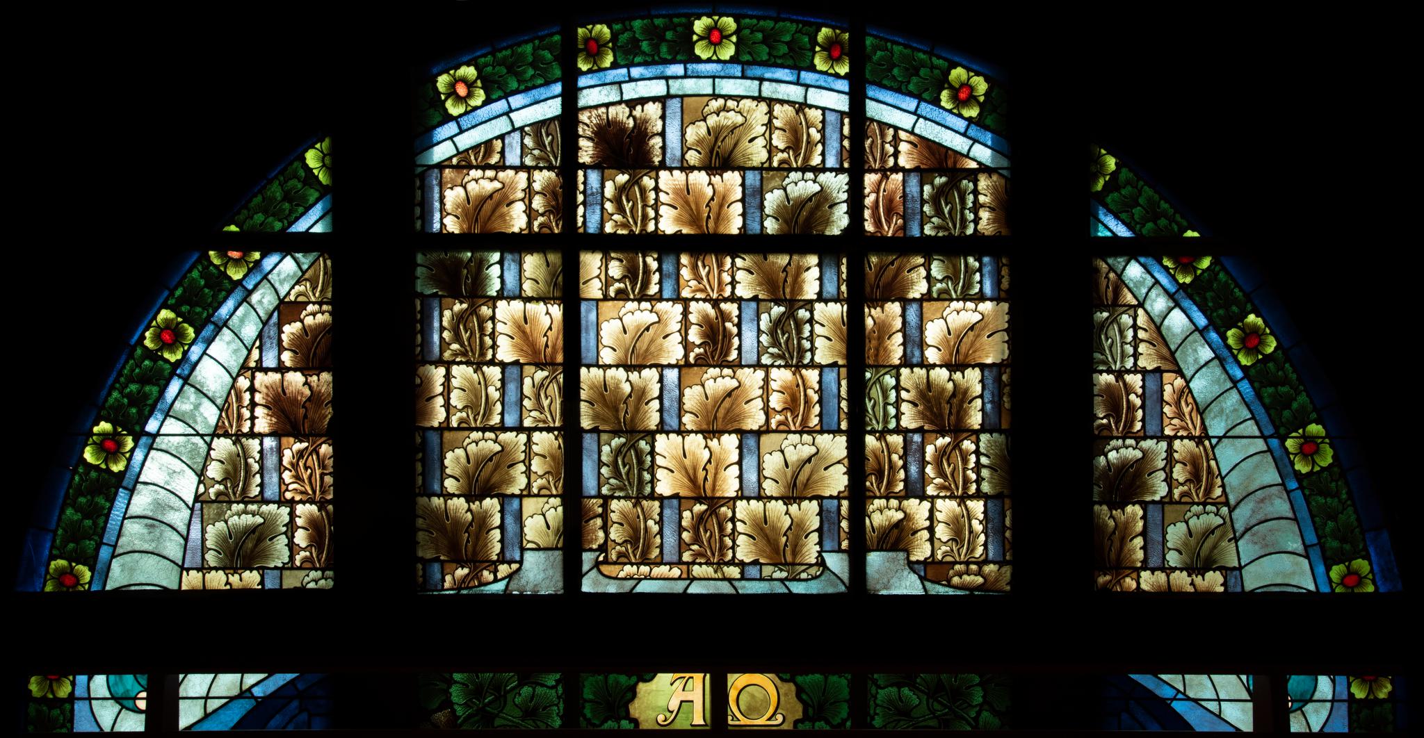 Mehrteiliges Thermenfenster, dessen zentrale Fläche ein Raster aus rechteckigen Glasstücken in hellblau und mit einem Jugendstilornament aus grünlich-braunen Gingko-Blättern einnimmt. Zwei Bordüren in hellblau und in grün mit einem Blatt- und Blütenmuster umrahmen die Glasmalerei. Am unteren Rand sind mittig die griechischen Buchstaben Alpha und Omega wiedergegeben.