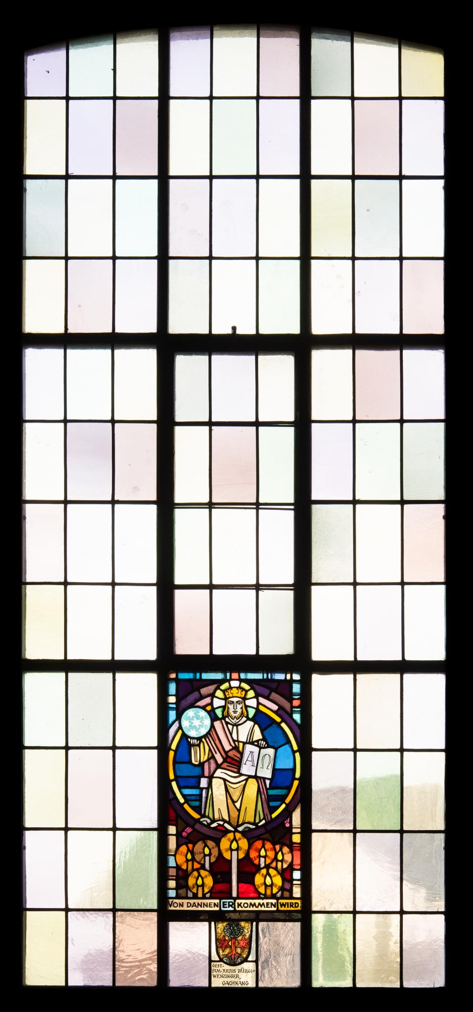 In zwölf Fenstern sind Sinnbilder des Apostolischen Glaubensbekenntnisses dargestellt. Hier ist Christus als Richter am Jüngsten Gericht, wie es im Credo und in der Inschrift genannt wird, dargestellt. Christus sitzt auf dem Thron und hält die Weltkugel in seiner rechten Hand, in seiner linken Hand ein geöffnetes Buch mit Alpha und Omega. Zu seinen Füssen brennen sieben Kerzen.