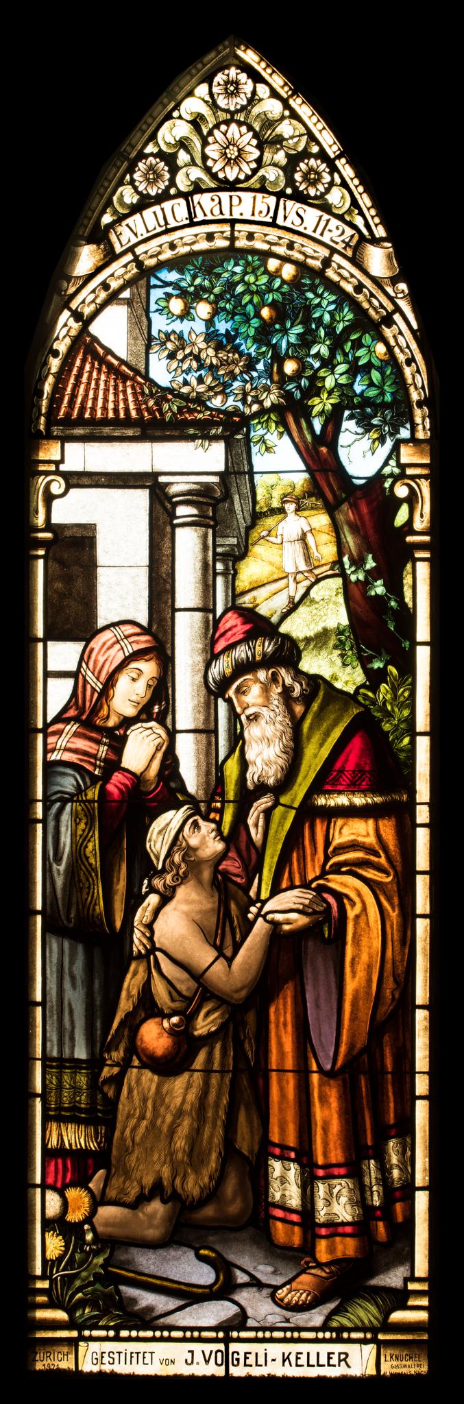 Spitzbogenfenster mit der Darstellung der Heimkehr des verlorenen Sohnes, gerahmt von einer Arkadenarchitektur mit floralem Ornament im Bogenfeld. Der Sohn kniet im Hirtengewand zu Füssen der reich gekleideten Eltern, die ihn in Empfang nehmen. Im Hintergrund sind das Elternhaus, ein Früchte tragender Baum und der von der Feldarbeit heimkehrende Bruder gezeigt. Am Scheibenfuss Stifterinschrift und Signatur.
