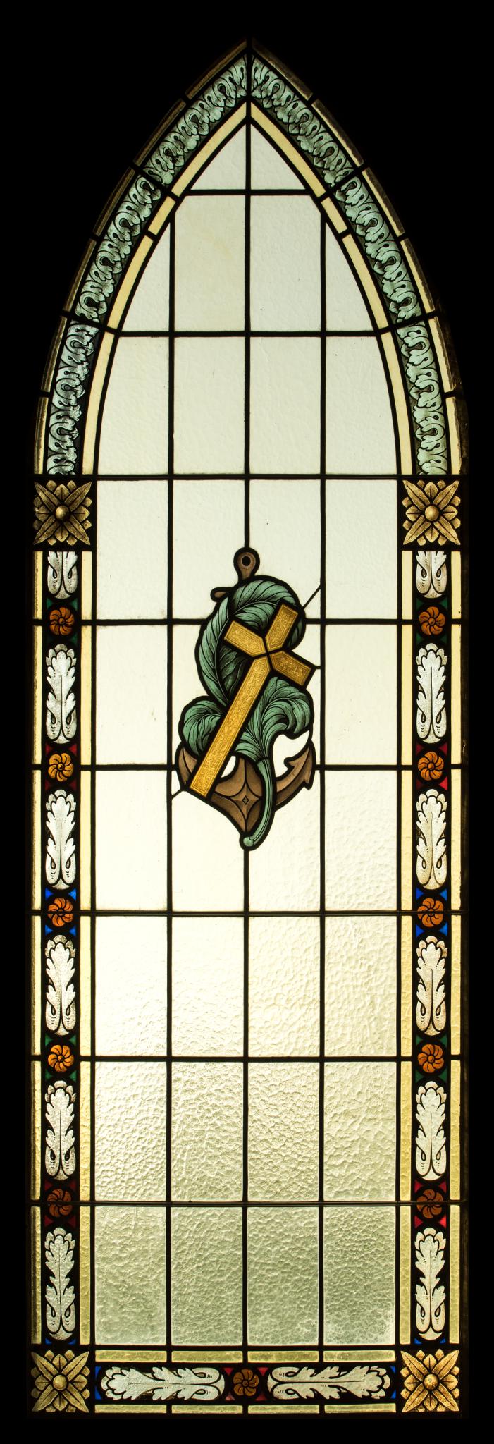 Spitzbogenfenster mit einer leicht getönten Blankverglasung, Rahmenverzierung und in der Mitte der Scheibe ein Anker mit Kreuz und einem Blattmotiv.