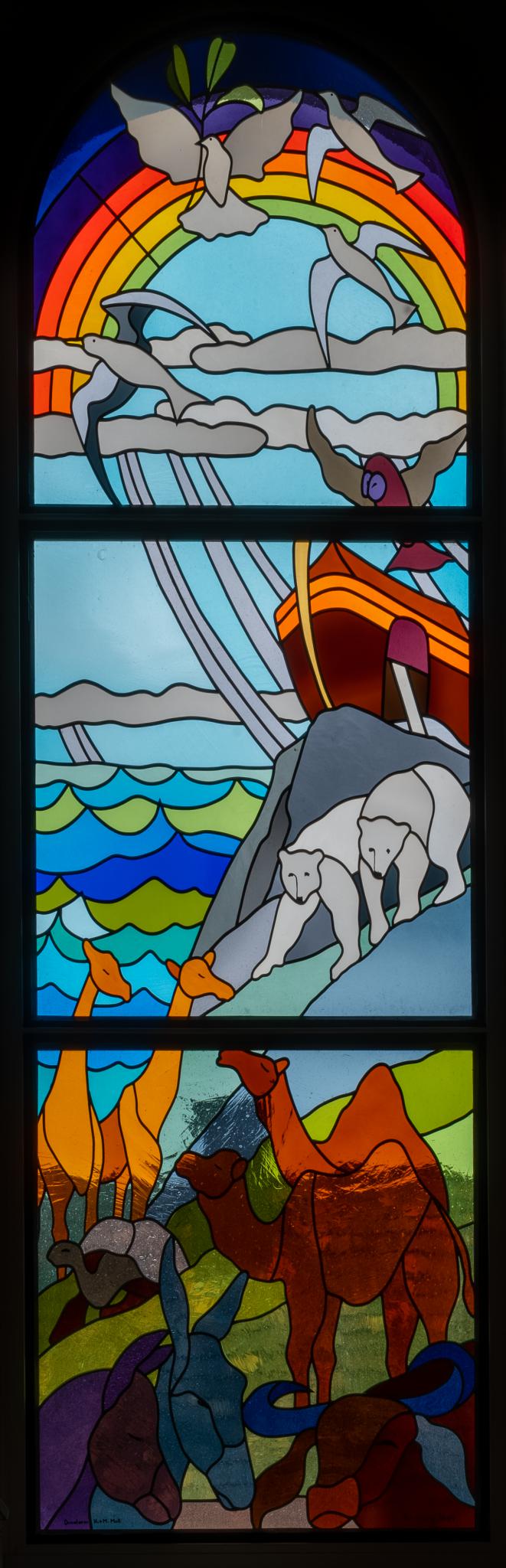 Rundbogenfenster mit Darstellung der Arche Noah auf dem Berg Ararat. Im Vordergrund gehen die aus der Arche ausgestiegenen Tiere (Eisbären, Giraffen, Schildkröten, Kamele, Esel und eine Kuh) an Land. Im Hintergrund ist das Meer zu sehen, rechts die gelandete Arche. Im Bogenfeld fliegen Möwen und die Taube mit dem Ölzweig vor dem Regenbogen.