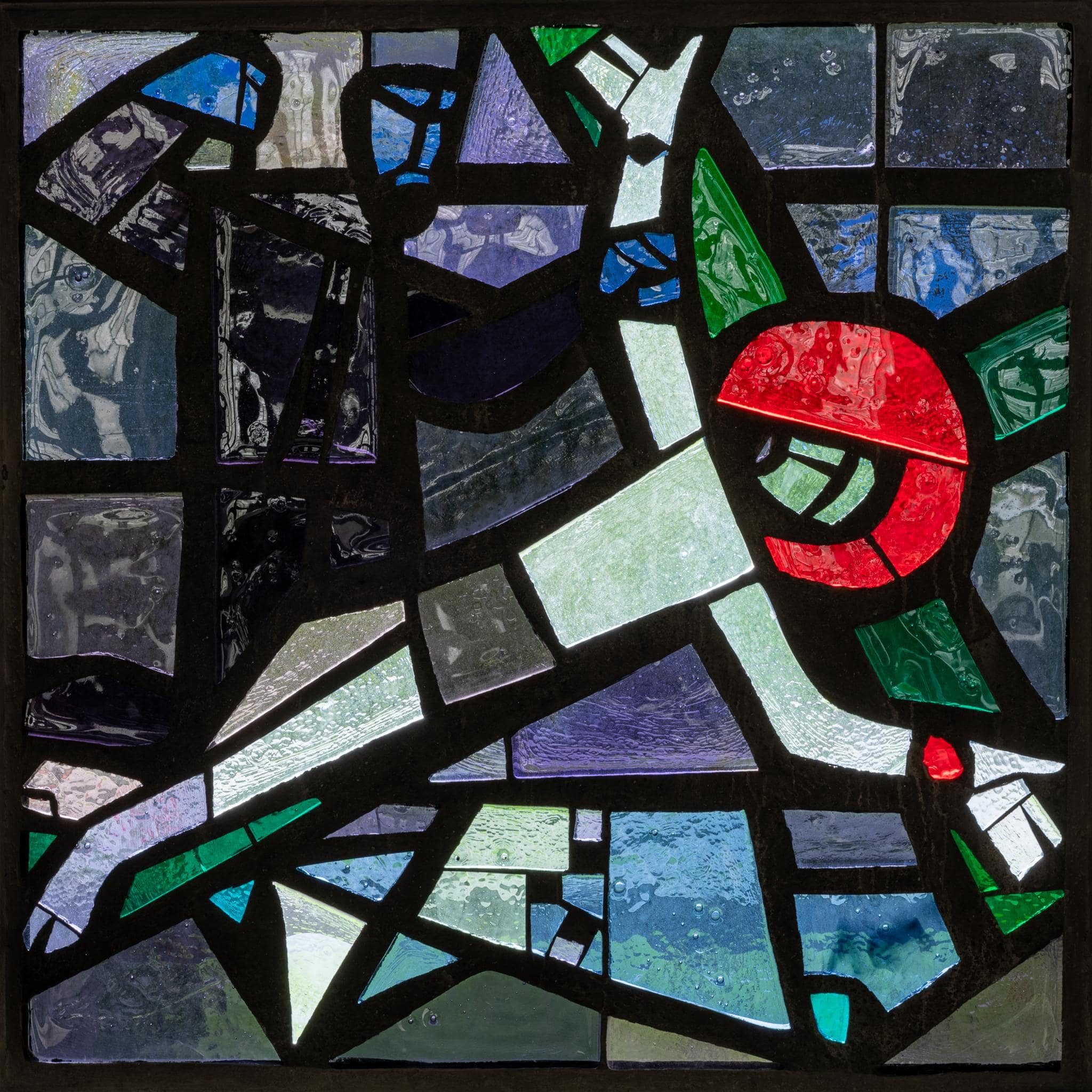 Quadratische Glasmalerei. Jesus wird an das Kreuz genagelt.