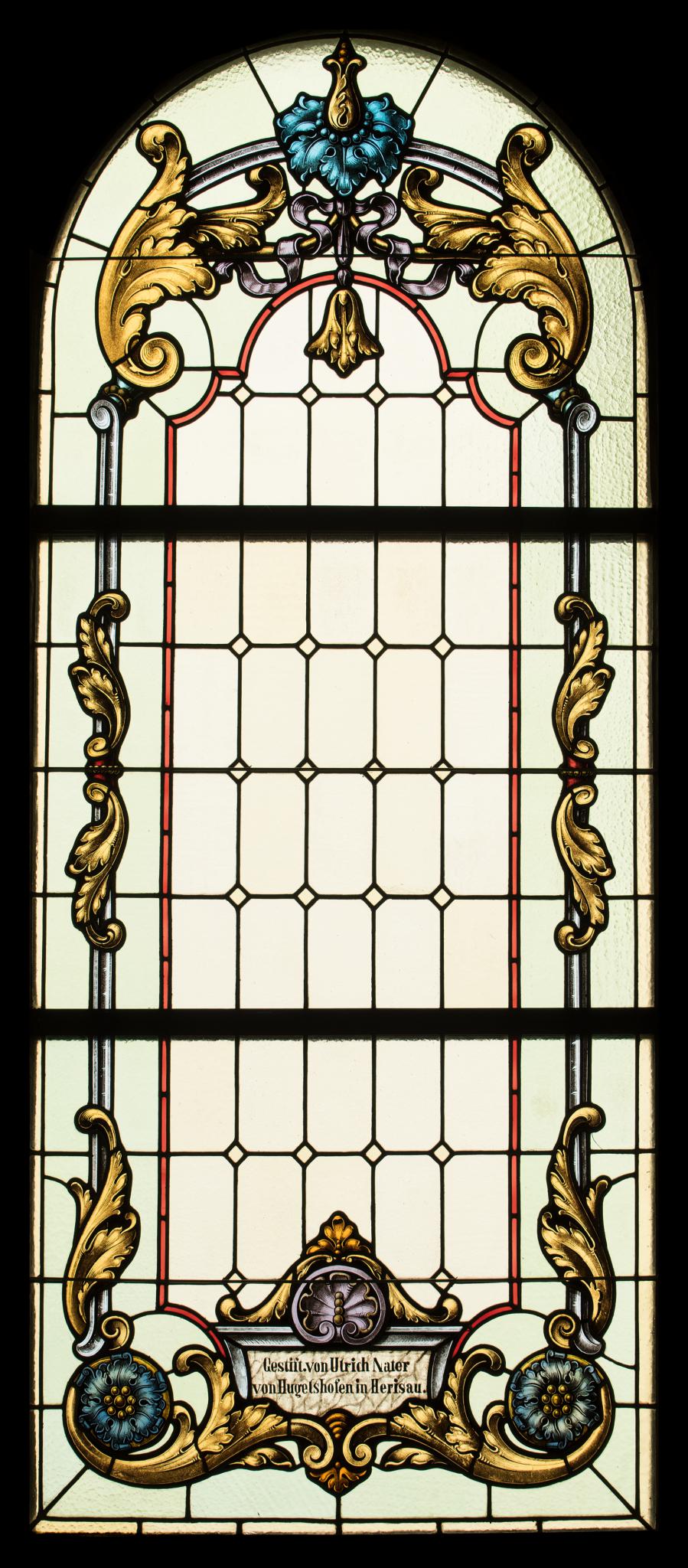 Rundbogenfenster mit einer breiten Rahmenbordüre aus Rocaillen, Blatt- und Blütenmotiven in den Farben Blau, Gelb, Rot und Lila. Die helle Fensterfläche ist durch dünne Bleistege in stehende Rechtecke geteilt. Im Sockelbereich Kartusche mit Stifterinschrift.