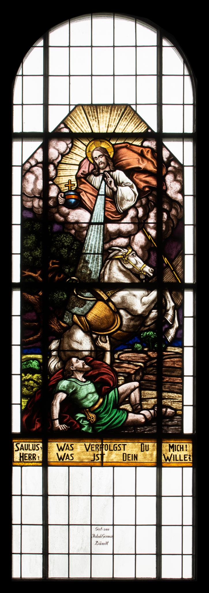 Mehrteiliges Rundbogenfenster mit Blankverglasung in Rechtecken und einem polygonalen Bildmedaillon im Zentrum. Darin ist die Bekehrung des Saulus (Apostelgeschichte 9, 1–19) dargestellt. Saulus fällt vom Pferd, als er, nach Damaskus reitend, vom auferstandenen Christus geblendet wird. Unterhalb des Medaillons Spruchband.