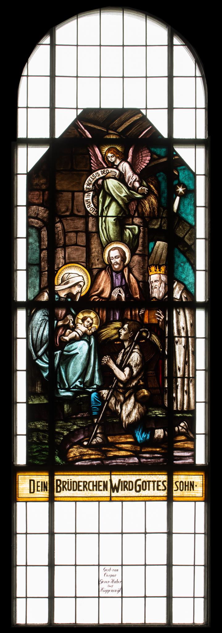 Mehrteiliges Rundbogenfenster mit Blankverglasung in Rechtecken und einem polygonalen Bildmedaillon im Zentrum. Darin ist die Geburt Christi gezeigt. Maria sitzt mit dem Säugling im Schoss da, während ein vor ihr kniender Hirtenjunge das Christuskind anbetet. Dahinter stehen Josef sowie ein König im Hermelinmantel, der eine Gabe darbringt. Über der Figurengruppe schwebt ein Engel mit einer Schriftbanderole. Unterhalb des Medaillons Spruchband.