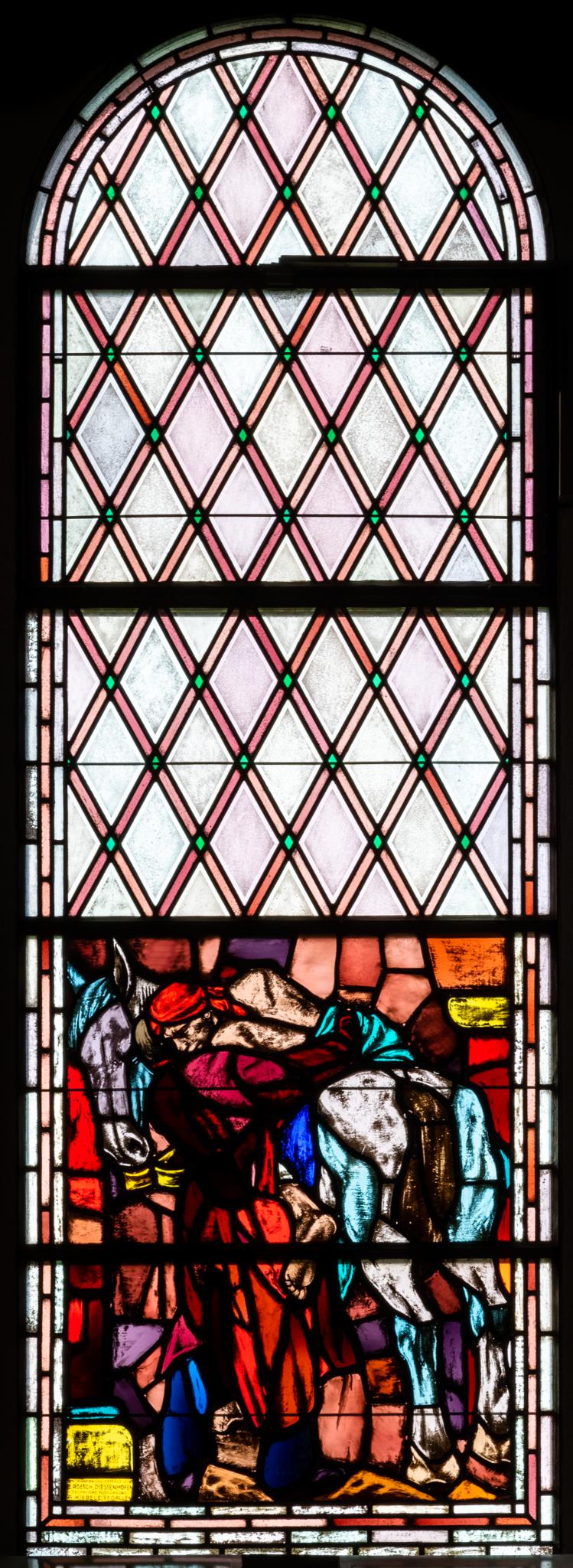Fünfteiliges Rundbogenfenster mit schmalem, violetten Rand. In den unteren beiden Feldern ist die Szene des barmherzigen Samariters dargestellt, der den verletzten Mann auf seinem Reittier hält. Übrige Fensterfläche mit leicht getönter Rautenverglasung gestaltet. Die Rauten werden aus violetten Glasstäben gebildet, deren Schnittpunkte grün sind.