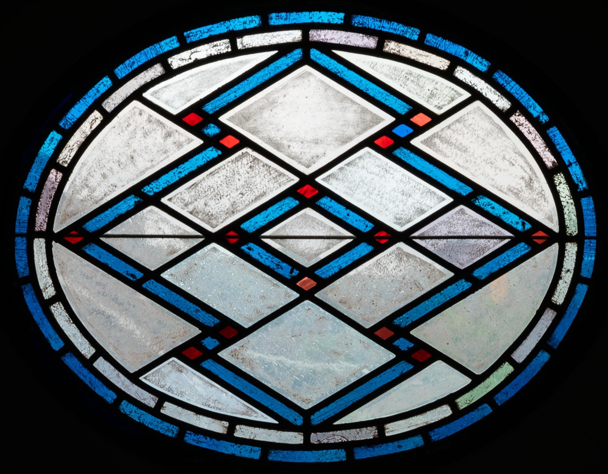Quergelagertes ovales Fenster mit blauem Rahmen und Rautenmuster. Die Rauten werden aus blauen Glasstäben gebildet, deren Eckpunkte rot sind.