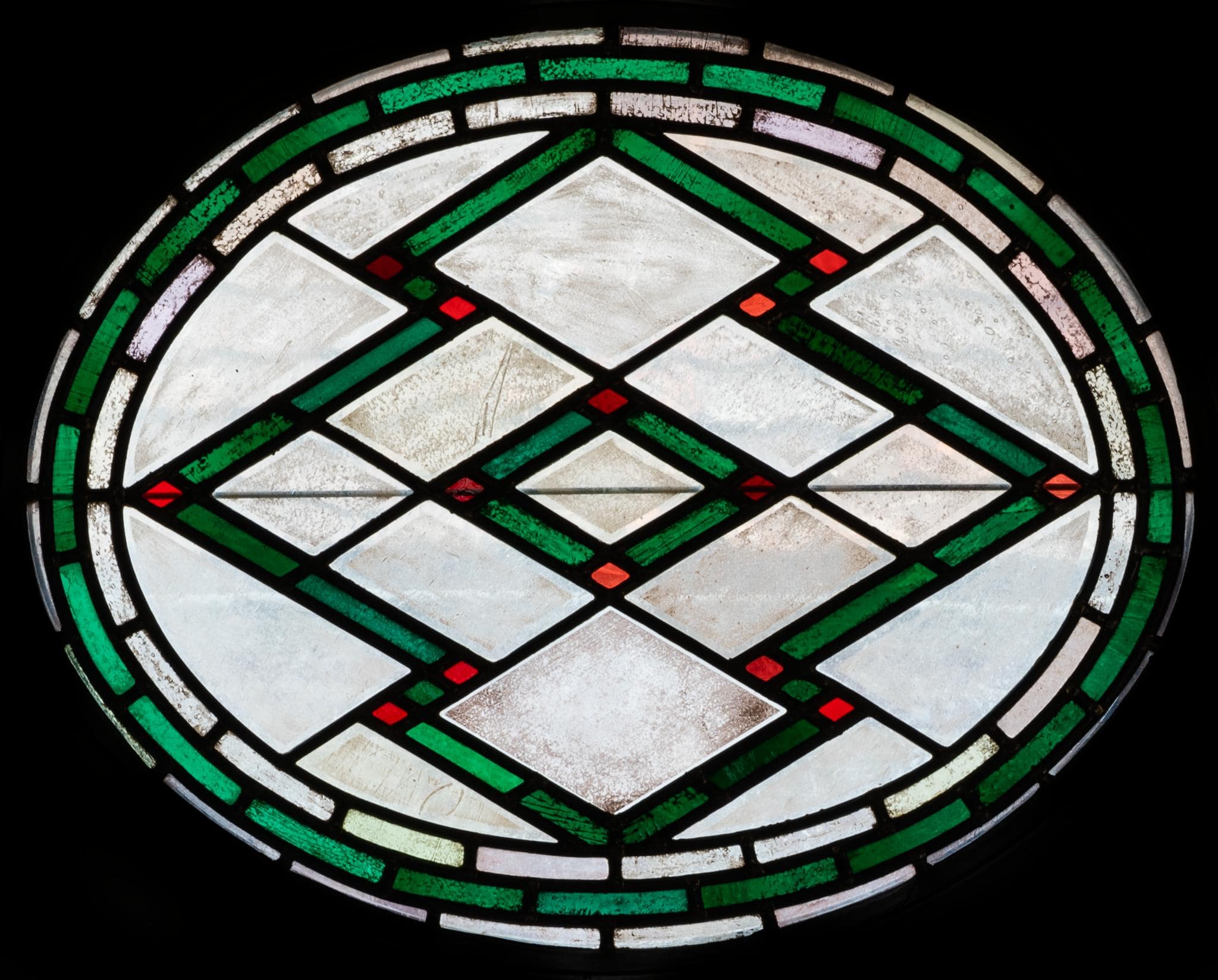 Quergelagertes ovales Fenster mit grünem Rahmen und Rautenmuster. Die Rauten werden aus grünen Glasstäben gebildet, deren Eckpunkte rot sind.