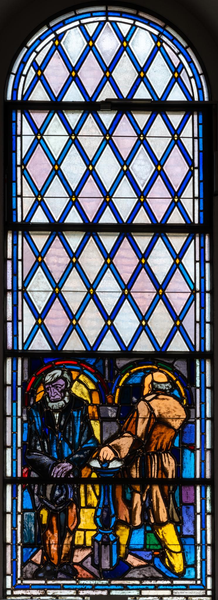 Fünfteiliges Rundbogenfenster mit schmalem, blauen Rand. In den unteren beiden Feldern ist vor einer Bogenarchitektur (Tempel) die Szene mit dem Pharisäer und dem Zöllner (bzw. eines Armen und eines Reichen am Opferstock) dargestellt. Links ist der demütig betende Zöllner gezeigt, der Gott um Gnade bittet, rechts der Pharisäer, der ein Geldstück in einen Opferstock legt. Übrige Fensterfläche mit leicht getönter Rautenverglasung gestaltet. Die Rauten werden aus blauen Glasstäben gebildet, deren Schnittpunkte gelb sind.