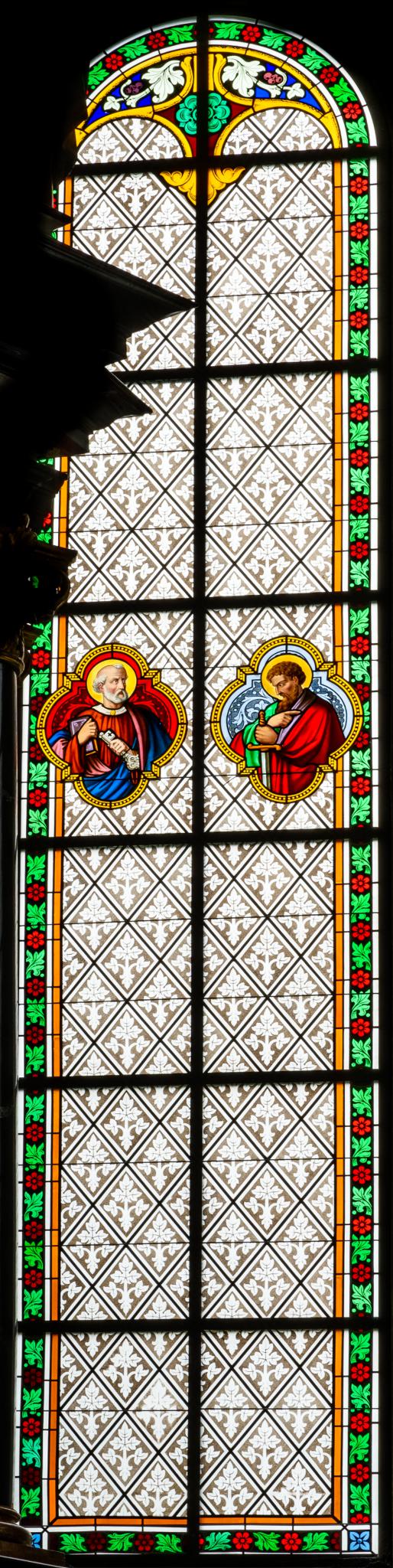 Rundbogenfenster mit Rautendamastmuster in Grisaille. Bogenfeld mit Blattornament und Blüten in Blau, Grün, Gelb und Rot gestaltet, Rahmenverzierung mit Blättern und Blüten in Grün und Rot. Im vierten Register zwei Vierpass-Kartuschen, links mit Petrus-, rechts mit Paulus-Darstellung (Brustbilder). Petrus ist mit den Attributen Buch und Schlüssel in den Händen gezeigt, Paulus mit dem Schwert.