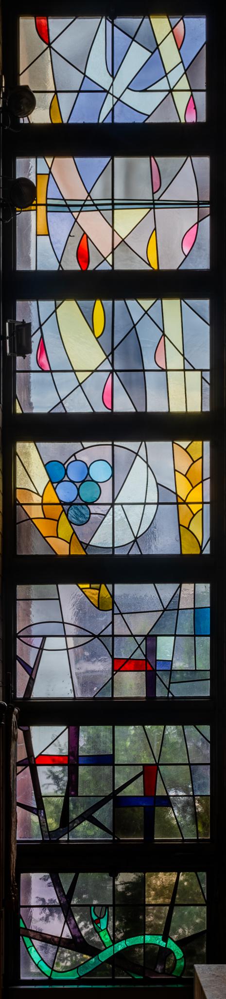 Die beiden raumhohen Glaswände im Chor zeigen mit Symbolen die sechs Sakramente. In diesem Fenster steht die Taube des Heiligen Geistes für die Firmung, und Traube und Ähren für die Eucharistie. Zuunterst ist die Beichte versinnbildlicht: die Schlange der Sünde wird durch die drei Kreuze der Lossprechung unschädlich gemacht.