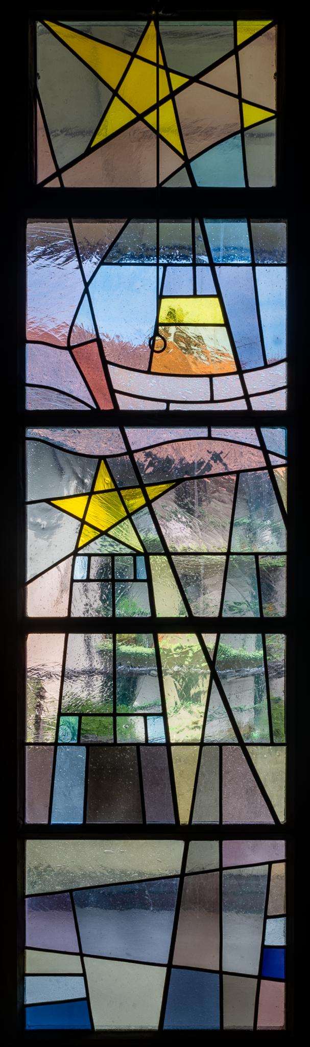 Hochrechteckiges Fenster mit Mariensymbolen (Morgenstern, Turm, Arche Noah).