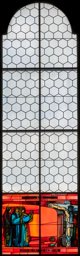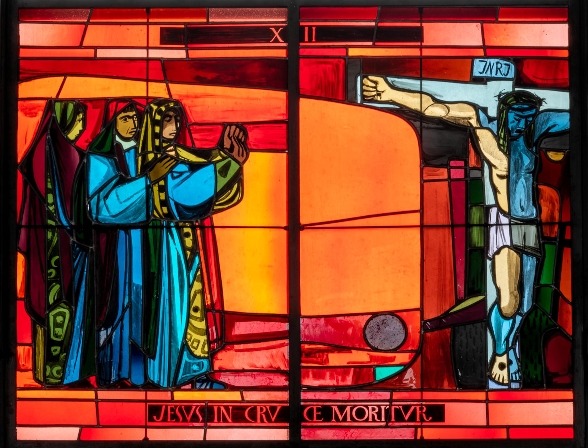 Rundbogenfenster mit blanker Rautenverglasung. Im unteren Teil des Fensters die zwölfte Station des Kreuzweges: Christus stirbt am Kreuz, links stehen die drei Marien.
