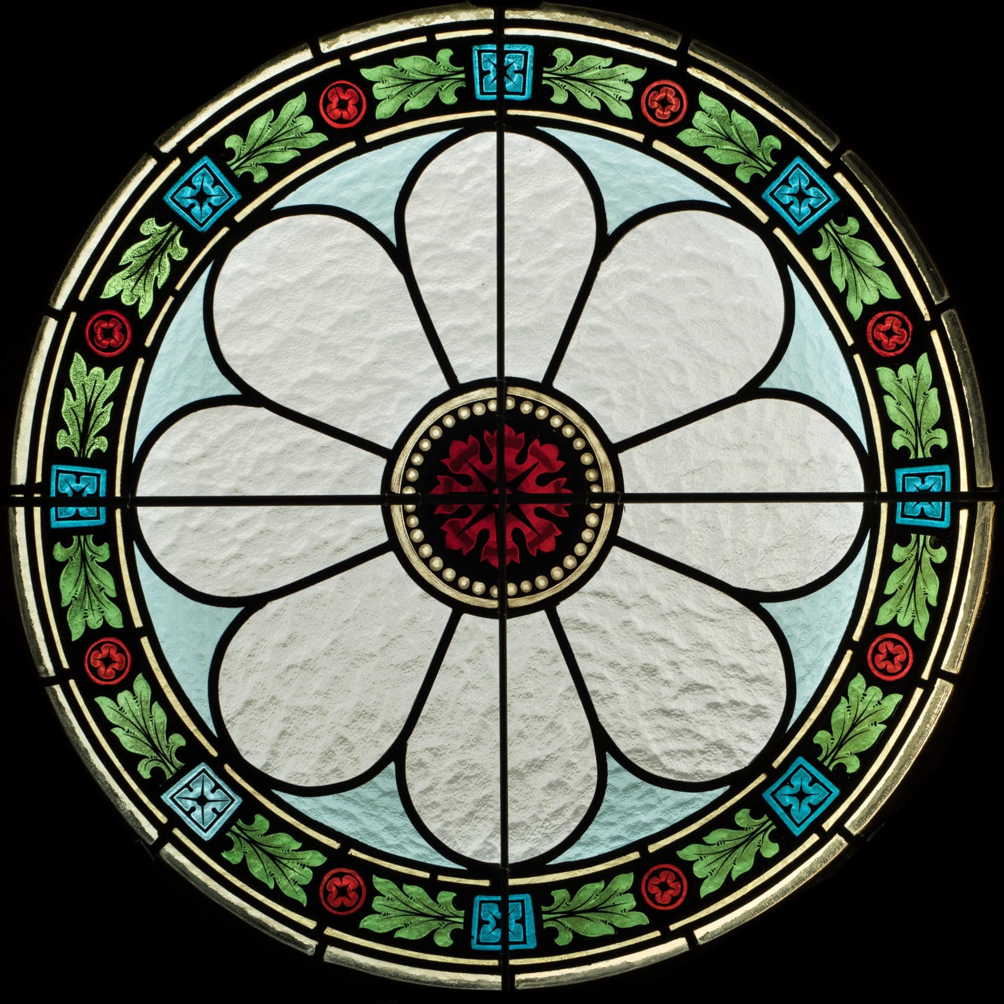 Rundfenster mit achtblättriger Rosette und floraler Randverzierung. Grundfarben Blau, Rot, Grün (identisch mit N IV).
