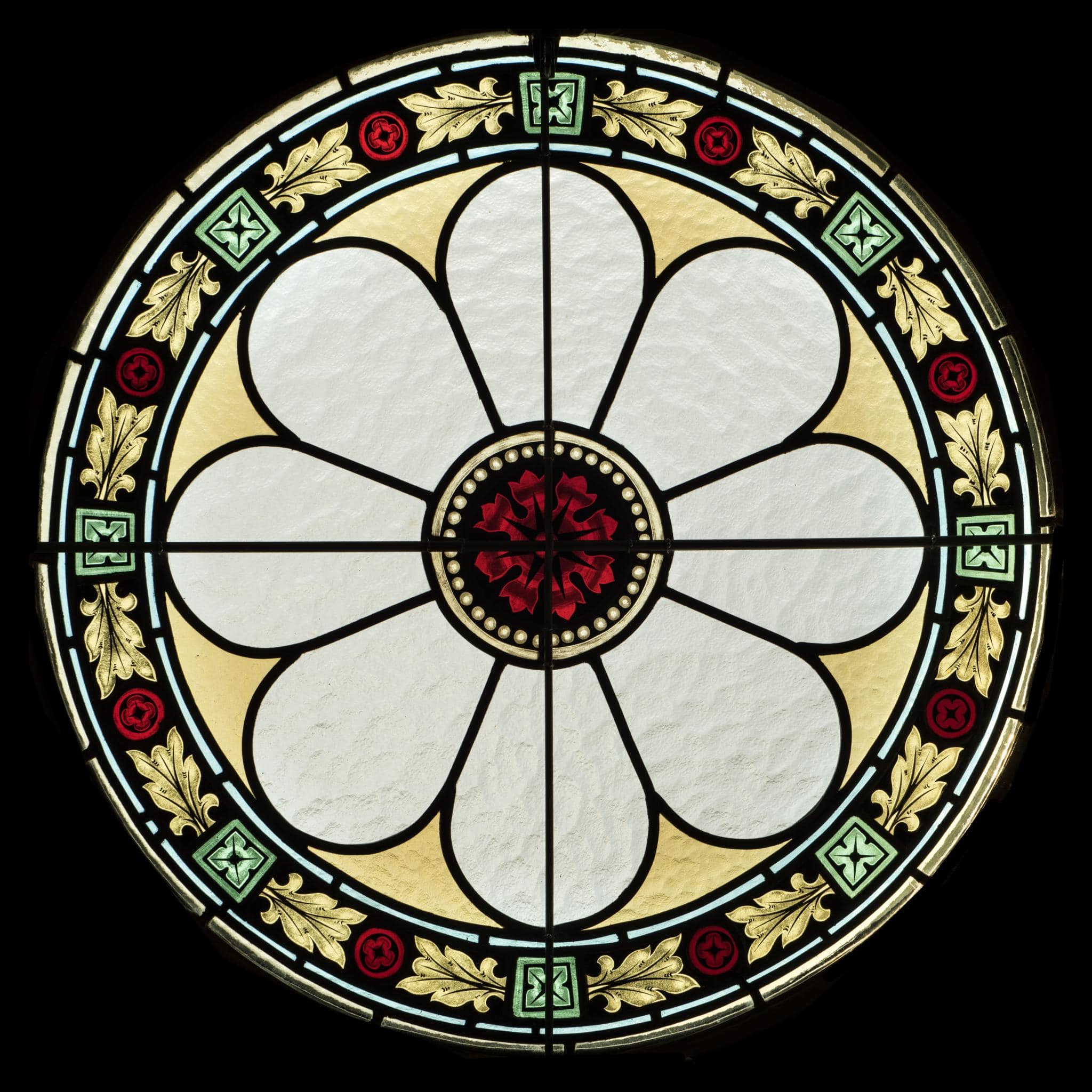 Rundfenster mit achtblättriger Rosette und floraler Randverzierung. Grundfarben Gelb, Rot, Grün (identisch mit n IV).