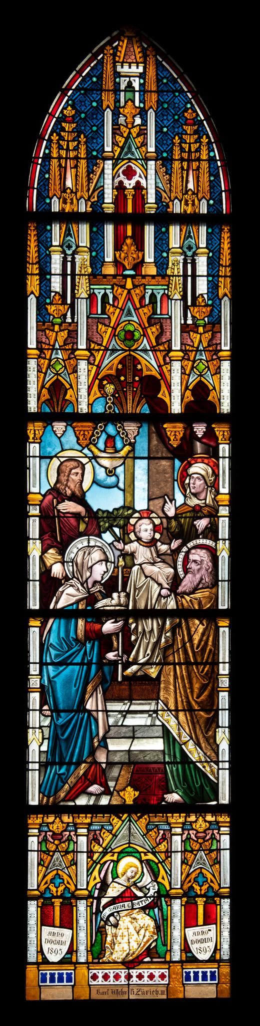 Spitzbogenfenster im neugotischen Stil. In der Bildmitte hält der Prophet Simeon das Christuskind in die Höhe. Maria steht zur anderen Seite des Kindes und hält eine Kerze und zwei Tauben in der Hand, die auf ihr Taubenopfer hinweisen. Hinter ihr steht Joseph und daneben die greise Prophetin Hanna. Zwei rahmende, schmale Pfeiler stützen die aus Wimpergen und Fialen gebildete Bekrönung. Im Sockelteil hält der Engel Gabriel ein Schriftband, daneben sind je ein Schild mit der Jahreszahl angebracht. Am Scheibenfuss befindet sich die Signatur Karl Wehrlis.
