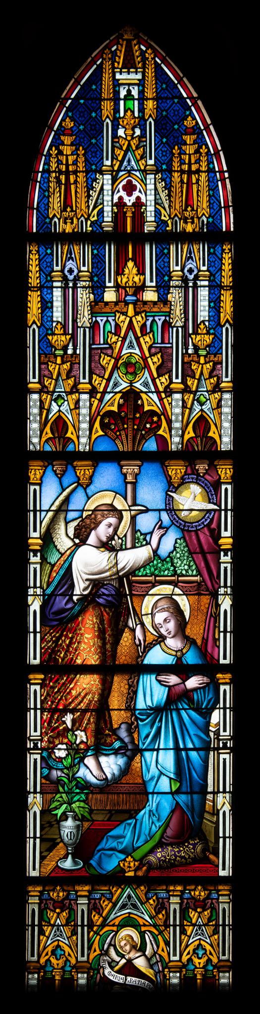 Die Chorfenster zeigen (von links beginnend): Maria Immaculata und Mariae Geburt, die Darbringung Marias im Tempel, die Verkündigung, die Heimsuchung, Geburt Christi, Jesus im Tempel, Flucht nach Ägypten, der zwölfjährige Jesus im Tempel, die Hochzeit von Kana. Entsprechend dem Stil der Architektur der Kirche, wählte Wehrli eine neugotische Formensprache für die Glasmalereien.