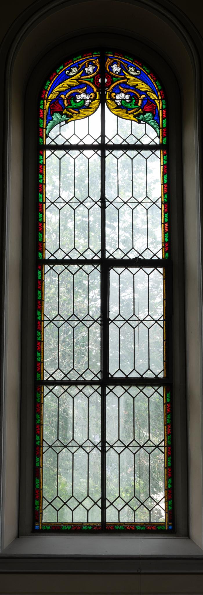 Rundbogenfenster (Blankverglasung mit Schweizerrauten) mit Zierrahmen sowie Ranken- und Bütenornamenten im Bogenfeld. Grundfarbe blau (identisch mit s V, n V).