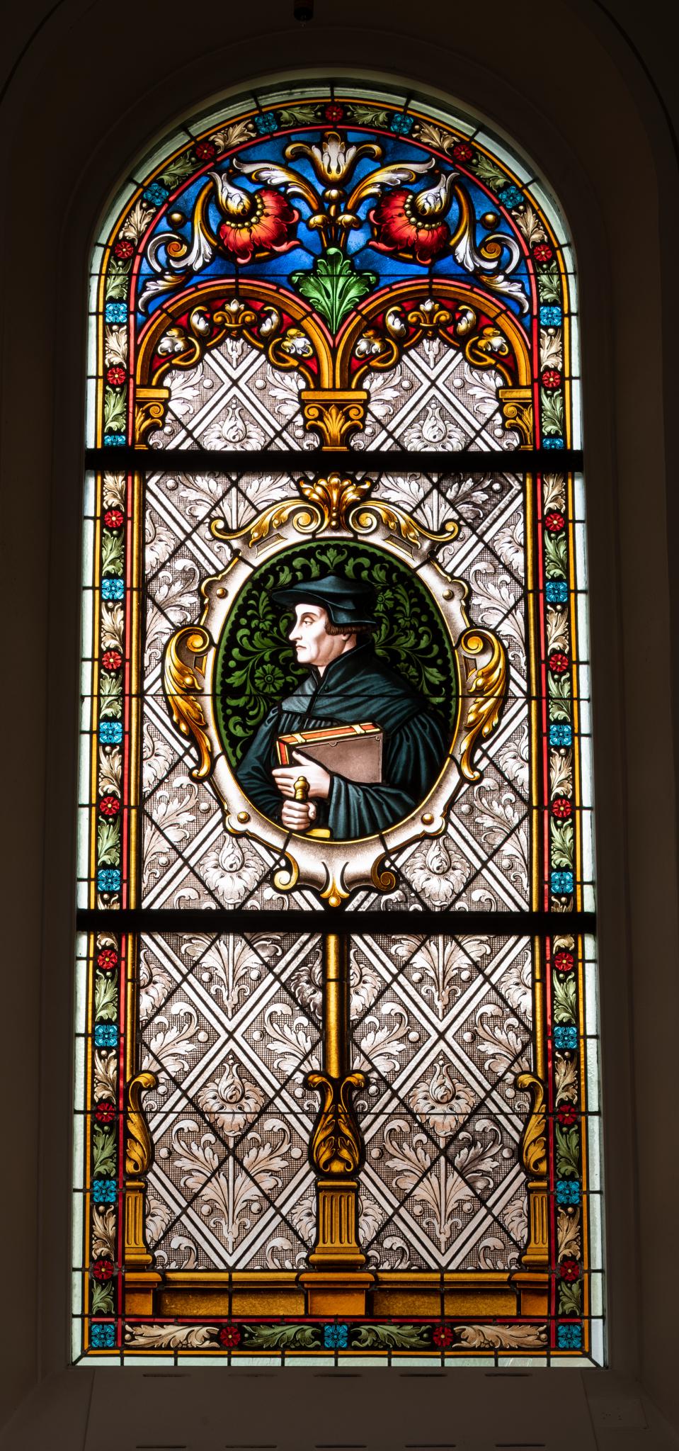 Rundbogenfenster mit Grisaille-Damastmuster (Rautenverglasung), rundbogiger Arkadenrahmung mit Mittelsäule und einem Medaillon mit dem Bildnis Ulrich Zwinglis mit Bibel als Bruststück im Zentrum. Im Bogenfeld üppiges Ranken- und Blumenmotiv, farbige florale Randverzierung. Grundfarben Grün, Blau, Rot und Gelb.