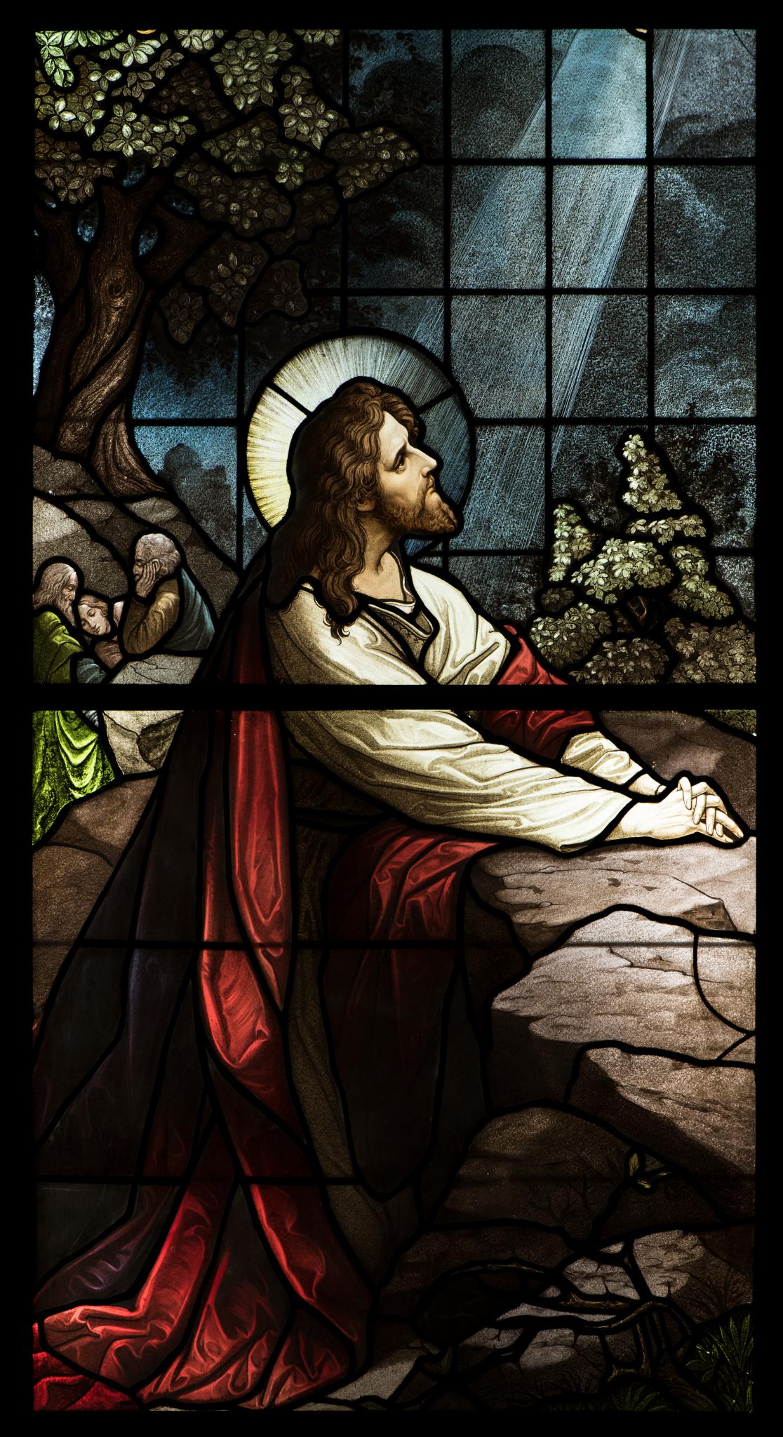 Ursprünglich vierteiliges Fenster mit einer Bildszene in den mittleren beiden Feldern, dem Wappen der Familie Diethelm und der Stifterinschrift im untersten Feld, sowie einem mit Engelsköpfen geschmückten Rahmen im Bogenfeld. Heute ist vom ursprünglichen Chorfenster nur noch die Bildszene erhalten, die Jesus Christus beim Gebet auf dem Ölberg kurz vor seiner Gefangennahme zeigt (Lk 22, 42). Im Hintergrund sind die schlafenden Jünger dargestellt.