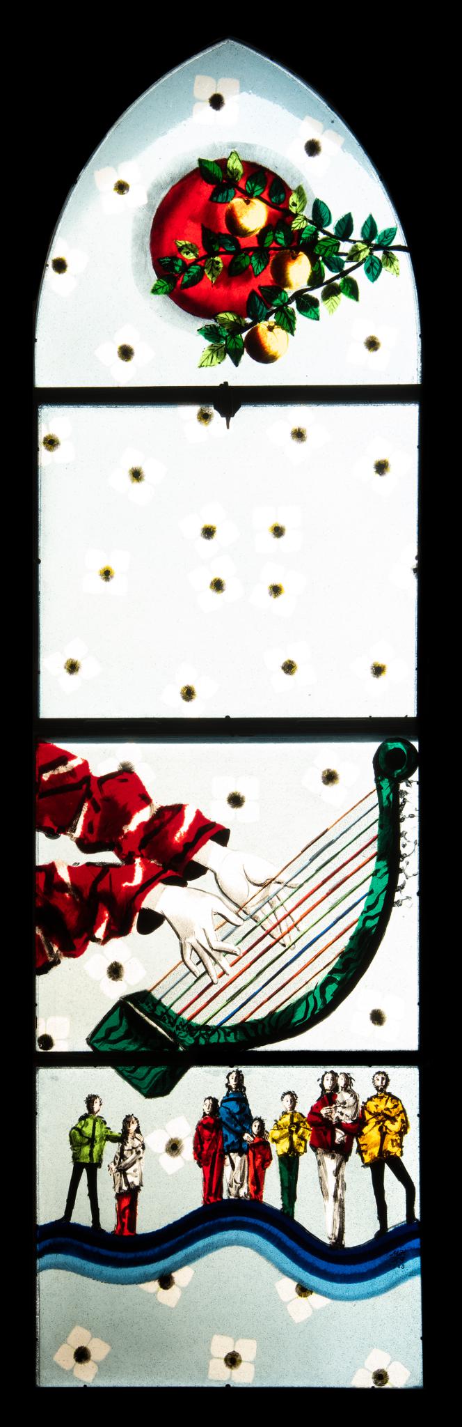 Zwei Hände spielen auf einer Harfe. Darunter stehen mehrere Menschen auf einer Welle. Im Bogenfeld erscheint ein mit Früchten behangener Zweig vor einer roten Kugel.