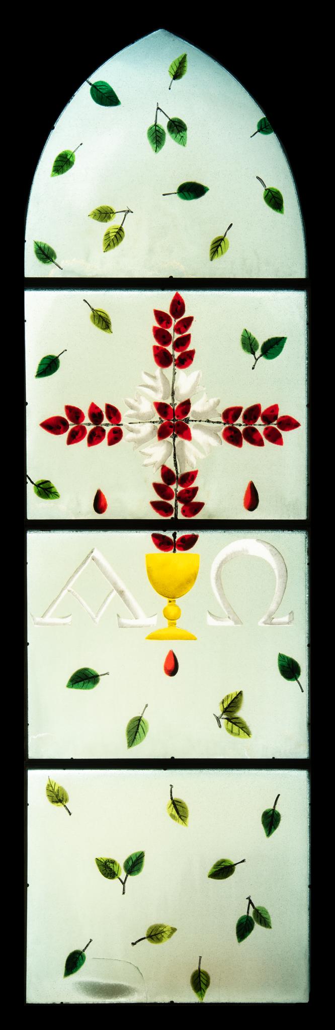 Aus einem goldenen Kelch erwächst ein aus roten und weissen Blüten gebildetes Kreuz. Alpha und Omega flankieren den Kelch.