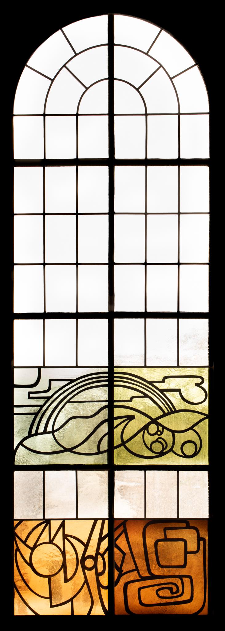 In drei Fenstern sind jeweils zwei Schöpfungstage verbildlicht. Hier ist unten der erste Schöpfungstag, die Entstehung des Lichts und damit die Teilung in Tag und Nacht, dargestellt. Oben erscheint der zweite Tag, die Schaffung des Himmelsgewölbes.