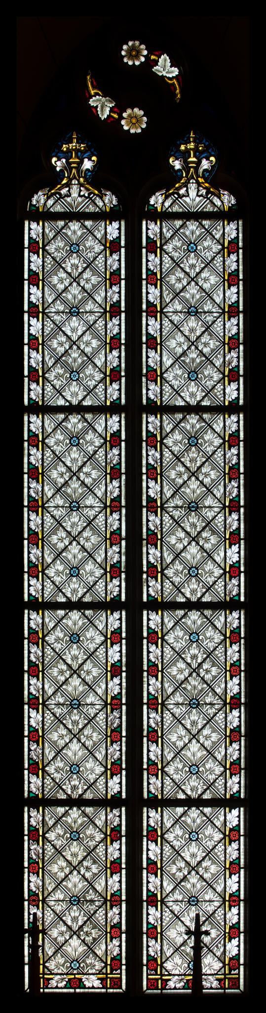 Zweilanzettiges Masswerkfenster mit Rautenverglasung. Die Fensterfläche ist mit einem Grisaillemuster (Blätter und Trauben) dekoriert, die farbige Randverzierung weist stilisierte Blatt- und Blütenmotive auf (identisch mit s III). An den Kreuzungspunkten der Rauten teils hellblaue Blüten. Masswerk mit farbigen Fialen und Blumendarstellungen.