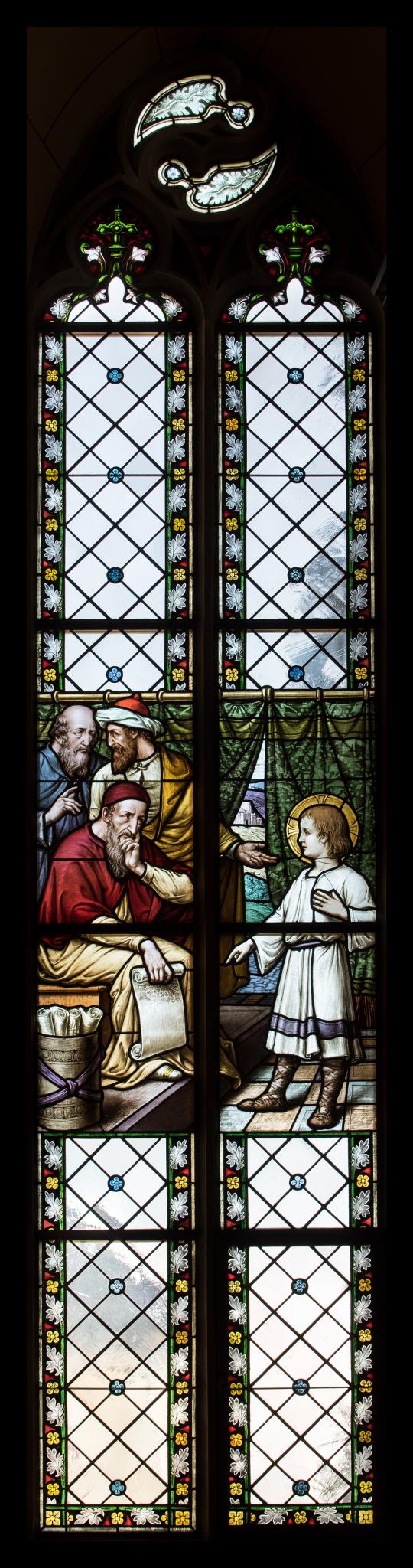 Das Christus im Tempel-Fenster gehört zu einer Gruppe von sechs Schifffenstern (vier Fenster mit Szenen aus dem Leben Christi und zwei Ornamentfenster), die 1908 im Zuge einer Kirchenrenovation eingesetzt wurden. Am 11. September 1907 hatte die paritätische Baukommission beschlossen, die Kirche zu renovieren (Arch. Albert Rimli, Frauenfeld), worauf eine kontroverse Diskussion zu Nutzen und Gestaltung der neuen Schifffenster folgte (Katholisches Kirchgemeindearchiv Sommeri, B12.03.05A, Parit. Kirchenvorsteherschaft Sommeri Sitzungsprotokolle 1835-1935, S. 240, 251). Im August 1908 lagen Offerten der Firmen Kirsch und Fleckner (Freiburg), Graf (Kreuzlingen), Kuhn (Basel), Berbig (Zürich) und Zettler (München/Winterthur) für Fenster mit und ohne Figuren vor (S. 260, 263, 264). Die Kommission zog unterdessen in Betracht, kleinere Bilder in den Mittelfeldern der Fenster anbringen zu lassen, damit die Kirche nicht zu dunkel würde. Da ein Bild von Zettler gut gefiel, wurden vom Vertreter der Zweigfiliale der Königlich Bayerischen Hofglasmalerei in Winterthur, Max Meyner, neue Vorschläge erbeten. Die Auswahl der Bildszenen (Szenen aus Kindheit und Jugend Christi sowie kirchliche Feste) übertrug man den beiden Pfarrern Dutli und Wellauer. Der Vertrag mit der Königlich Bayerischen Hofglasmalerei von F.X. Zettler wurde im August 1908 abgeschlossen, die sechs Fenster für den Preis von insgesamt 3600.– Franken im Dezember 1908 nach Sommeri geliefert (Evang. Kirchgemeindearchiv Amriswil, 6.50.c Kirche Sommeri, Renovation 1908/09 (Umschlag Kirchenrenovation 1908/09): Vertrag vom 22.8.1908 und Rechnung vom 28.12.1908).