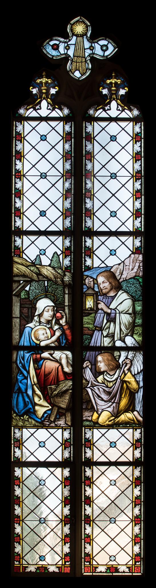 Das Weihnachtsfenster gehört zu einer Gruppe von sechs Schifffenstern (vier Fenster mit Szenen aus dem Leben Christi und zwei Ornamentfenster), die 1908 im Zuge einer Kirchenrenovation eingesetzt wurden. Am 11. September 1907 hatte die paritätische Baukommission beschlossen, die Kirche zu renovieren (Arch. Albert Rimli, Frauenfeld), worauf eine kontroverse Diskussion zu Nutzen und Gestaltung der neuen Schifffenster folgte (Katholisches Kirchgemeindearchiv Sommeri, B12.03.05A, Parit. Kirchenvorsteherschaft Sommeri Sitzungsprotokolle 1835-1935, S. 240, 251). Im August 1908 lagen Offerten der Firmen Kirsch und Fleckner (Freiburg), Graf (Kreuzlingen), Kuhn (Basel), Berbig (Zürich) und Zettler (München/Winterthur) für Fenster mit und ohne Figuren vor (S. 260, 263, 264). Die Kommission zog unterdessen in Betracht, kleinere Bilder in den Mittelfeldern der Fenster anbringen zu lassen, damit die Kirche nicht zu dunkel würde. Da ein Bild von Zettler gut gefiel, wurden vom Vertreter der Zweigfiliale der Königlich Bayerischen Hofglasmalerei in Winterthur, Max Meyner, neue Vorschläge erbeten. Die Auswahl der Bildszenen (Szenen aus Kindheit und Jugend Christi sowie kirchliche Feste) übertrug man den beiden Pfarrern Dutli und Wellauer. Der Vertrag mit der Königlich Bayerischen Hofglasmalerei von F.X. Zettler wurde im August 1908 abgeschlossen, die sechs Fenster für den Preis von insgesamt 3600.– Franken im Dezember 1908 nach Sommeri geliefert (Evang. Kirchgemeindearchiv Amriswil, 6.50.c Kirche Sommeri, Renovation 1908/09 (Umschlag Kirchenrenovation 1908/09): Vertrag vom 22.8.1908 und Rechnung vom 28.12.1908).