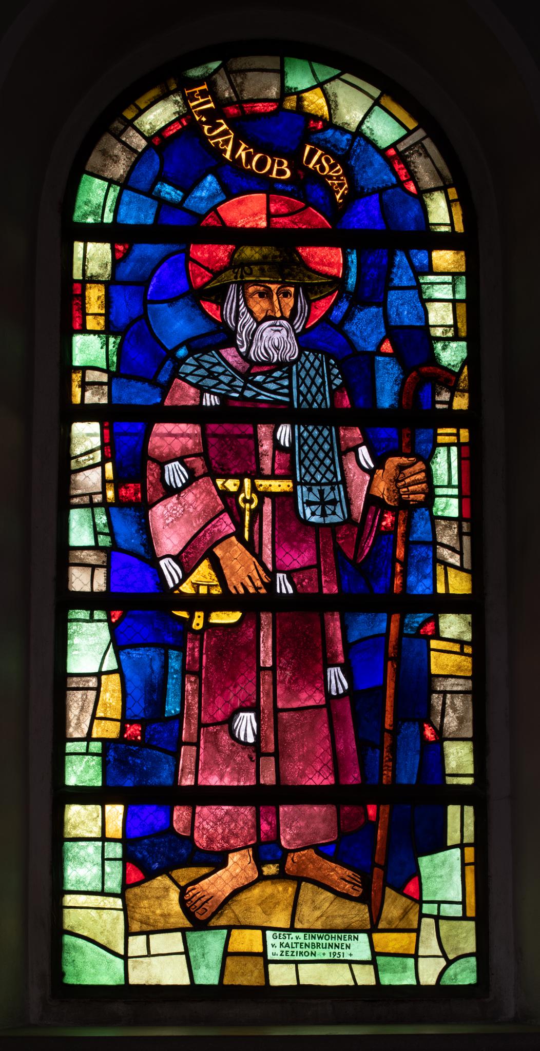 Der Kirchenpatron, der heilige Jakobus der Ältere, mit Pilgerstab in der Hand.