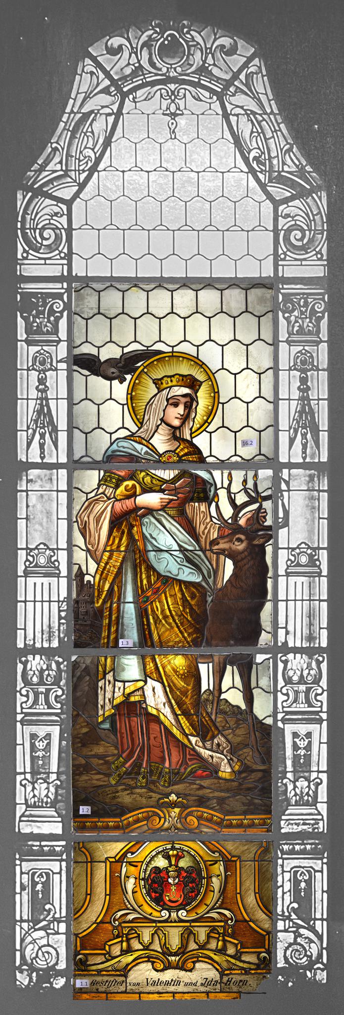 Fragmente einer Fensterverglasung mit der Darstellung der heiligen Idda von Toggenburg auf einem architektonisch gestalteten Sockel. Die Heilige ist in reichem Gewand und mit Krone vor einer Burg dargestellt. In der rechten Hand hält sie ein Kruzifix, zu ihrer Linken steht der Hirsch mit flammendem Geweih, über der Heiligen schwebt der Rabe mit dem Ring im Schnabel. Ein breiter Rahmen mit geschmückten Säulen im Stil der Renaissance umfasste ursprünglich das ansonsten blank verglaste Fenster. Im Sockel Vollwappen der Stifter, an der Sockelbasis Stifterinschrift. Erhalten sind die Felder mit der Figur der Heiligen und der Sockel.